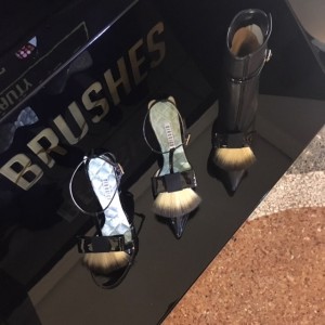 Vite vite, il est presque 13h et j’accélère le pas direction le quadrilatero della moda. J’ai rendez-vous pour une présentation chez Giannico, un (très) jeune créateur de chaussures qui assure aujourd’hui le lancement de sa nouvelle collection. Inspirés du monde du makeup après un voyage de Paris jusqu’au Japon, les jolis souliers déclinent 4 thématiques :lips, eyes, face et brushes. Pour face on retrouve la mode du contouring dans la palette et une boucle poudrier. Pour eyes, ce sont des couleurs fortes tirés des archives des années 50 qui ont inspiré le designer. Brushes restent la proposition la plus ludique car d’adorables moustaches en plumeaux viennent prendre position sur le dessus des chaussures.