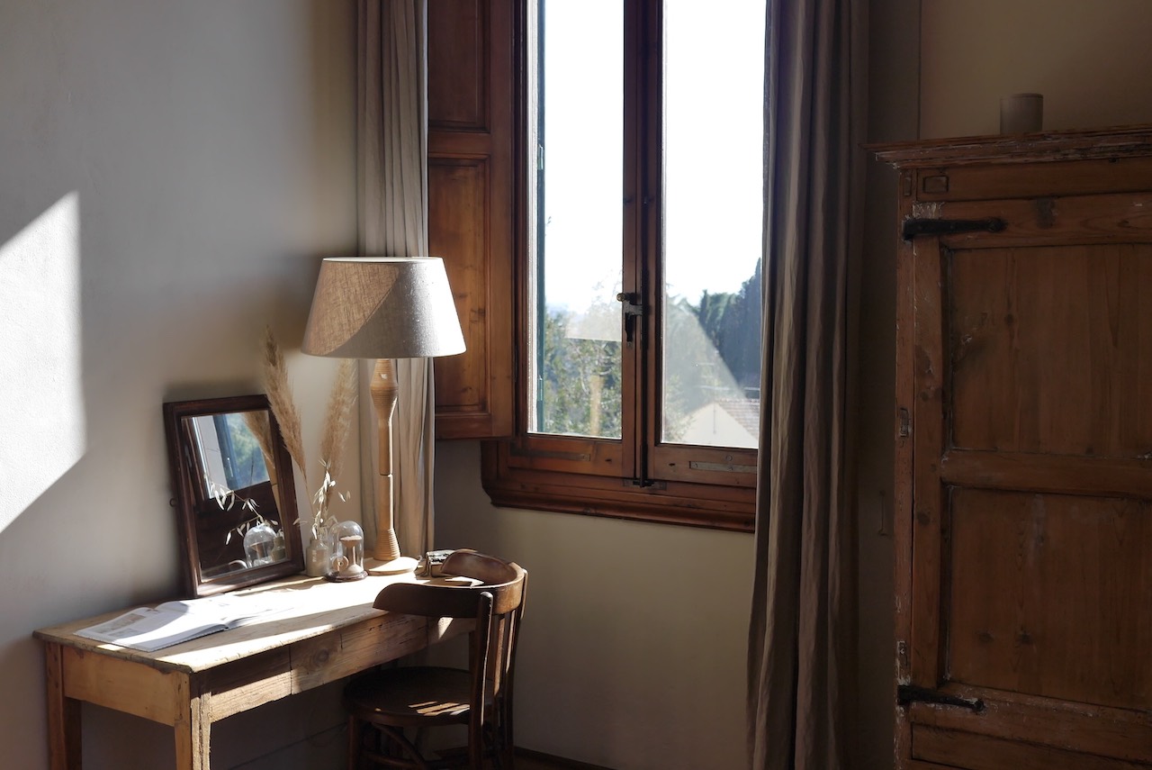 Ne cherchez pas de plastique dans la maison, il n’y en a pas ! J’ai pu faire un tour rapide des 5 chambres (dont 1 single) et la magnifique maison propose une ambiance shabby-chic-monacale (beaucoup de beige, de bois, de fleurs séchées, de matières douces, quelques touches de métal bien senties). Pourtant, rien n’est froid, rien n’est triste. Les yeux se reposent et on apprécie la lumière douce, la vue sur la nature depuis pratiquement toutes les fenêtres. Clou du spectacle, la loggia du premier étage où l’on admire jusqu’au Duomo de Florence.