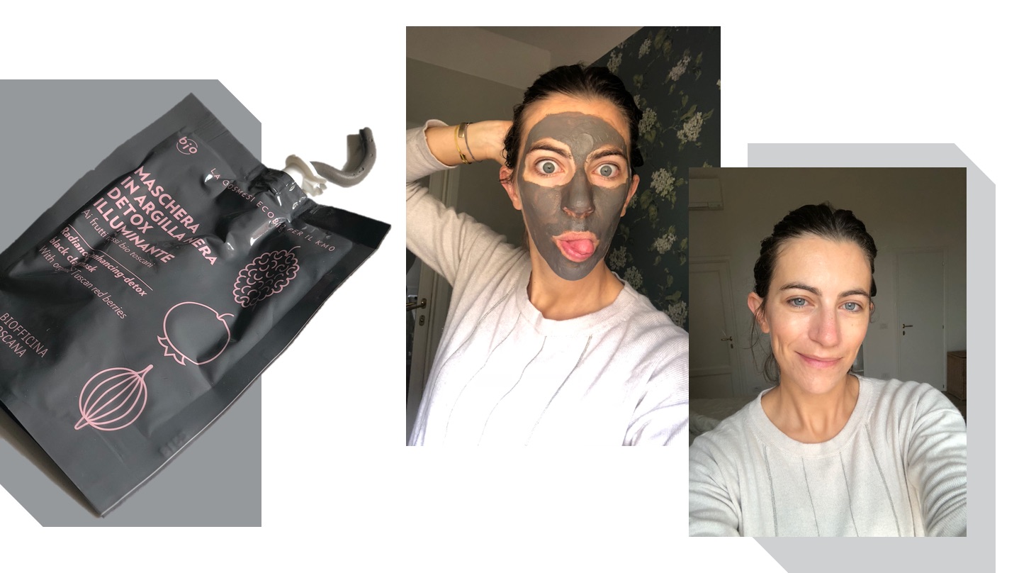 - Le masque mono-dose à l’argile noire detox illuminante : une texture d’argile ultra-confortable (assez surprenante, je l’aurais pensé plus dure à appliquer et à retirer) et une peau vraiment très fraiche à la sortie grâce aux fruits rouges des collines toscanes . Evidemment le format mono dose est pratique (moyen sur l’environnement je vous l’accorde). Seul point noir (hahaha) la longueur de l’application : il faut attendre 15 minutes, or j’ai 15 minutes pour moi tous les 45 jours.