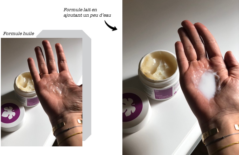 - Le beurre démaquillant : aux fruits rouges, il est ultra-crémeux et la texture se transforme au contact de l’eau. Vous pouvez vous en servir soit en huile en version sèche, soit en lait en version humide. Il ne laisse aucun résidu côté texture. Il ne quitte plus ma douche !