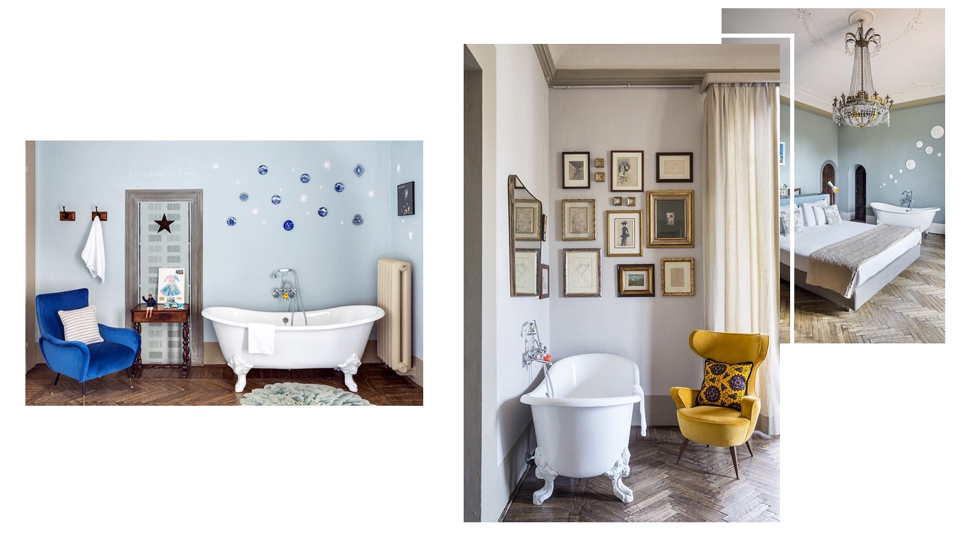La façon dont Matteo agence les chambres du Ad’astra est exceptionnelle. Toutes les chambres sont pensées comme des suites luxueuses, notamment grâce à la présence de la baignoire dans la chambre. Une baignoire à l’ancienne, bien évidemment. J’aime beaucoup aussi le fait qu’il crée un passage derrière la tête de lit avant le mur, un espace qui devient rangement, et fait respirer la chambre en centrant le lit au milieu de celle-ci. Malin quand on a une grande chambre.