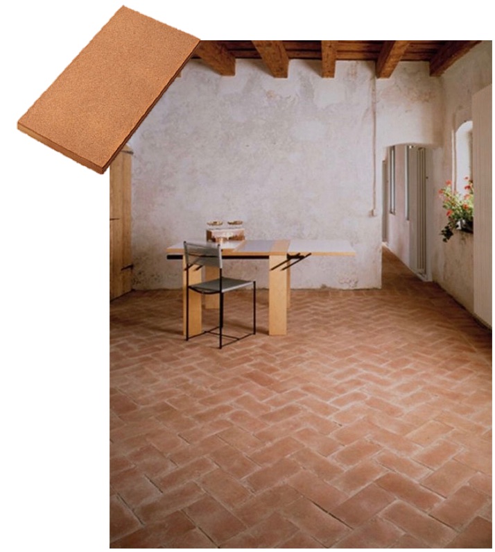 J’avais très envie de vous parler de la terre cuite italienne, appelée Terracotta, dont l’aspect rouge est maintenu brut après la cuisson. Je la retrouve partout ici en Toscane : dans les palais, les appartements du centre et surtout les maisons dites « Collonica » anciennes maisons de campagne et ferme agricole situées sur les collines. La terracotta est fabriquée dans le petit village de l’Impruneta à l’entrée du Chianti. Je connais bien la société Manetti chez qui j’ai commandé la mienne mais il y en a plein d’autres. Ces sociétés produisent deux types de « cotto » : avec des machines ou bien alors à la main. Ce dernier rendu est vraiment magnifique car plus irrégulier (parfait pour un effet campagne chic) et dans des couleurs plus douces, plus passées. La terre cuite n’est plus rouge mais rosée, avec des effets blanchis, patinés.