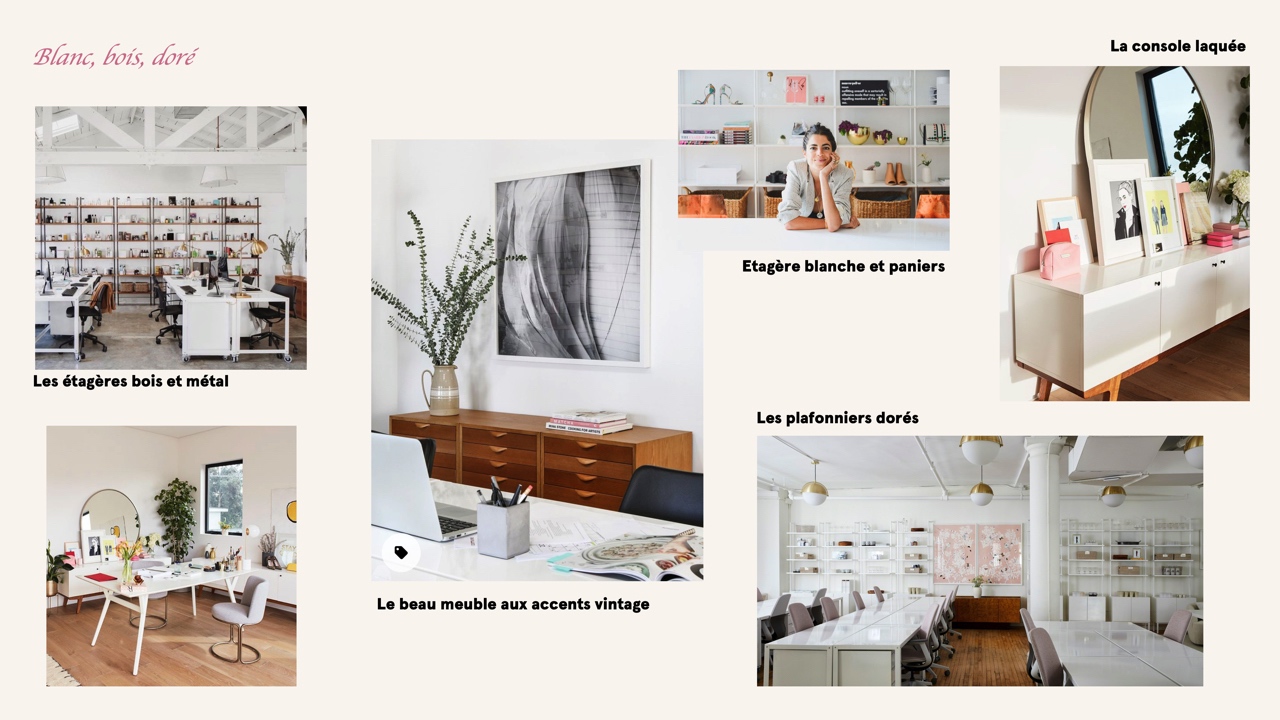 J’aime la couleur mais j’ai besoin quand même d’une base nette, clean avec du blanc. J’aime par contre l’idée d’aller réchauffer tout cela avec des touches de bois, de doré aussi notamment dans les luminaires. Tout de suite, l’atmosphère fait plus sophistiquée. J’ai bien aimé les images trouvées chez Leandra Meline dans son bureau de Soho : pour quelqu’un à la personnalité aussi foufou, on trouve une base chouette et simple qui permet toutes les fantaisies.