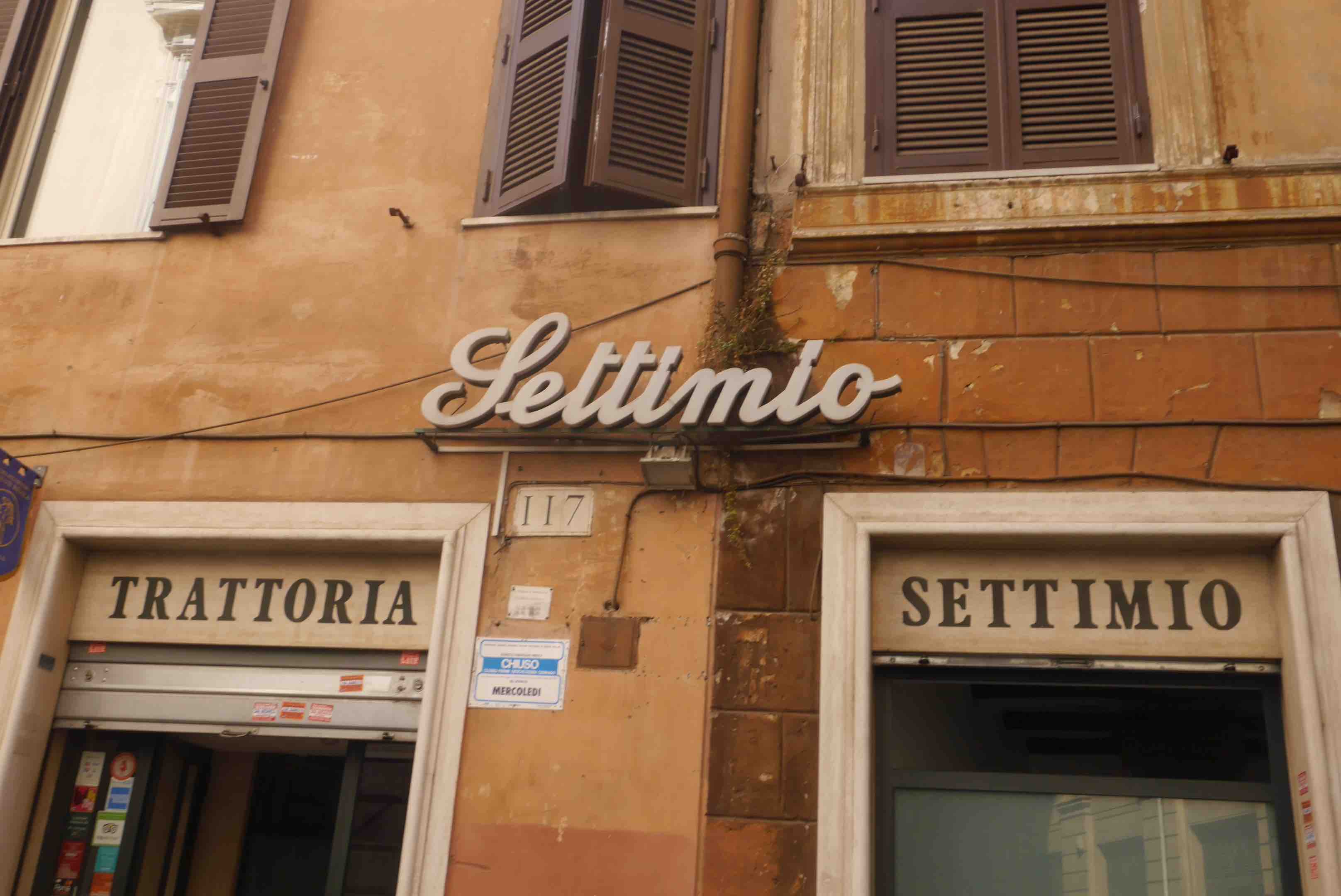 Pour ce deuxième post dans la catégorie des enseignes italiennes adorables, on part à Rome pour observer la devanture de la trattoria familiale Settimio. Je suis totalement fan de la typo qu’ils ont utilisé et de l’air joliment désuet qui se dégage du résultat. Avec cette couleur de mur et ses volets… aucun doute, on est bien à Rome !