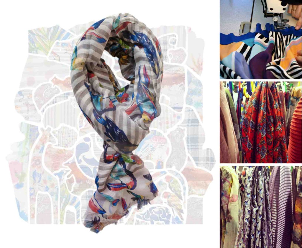 Dans leur atelier de Come, la marque Franco Ferrari crée et imprime des merveilles ! Les foulards et écharpes jouent sur des associations de texture (chinchilla, soie, laine, coton) et les imprimés animaliers ou fantaisies vraiment magnifiques. j’ai adoré le motif oiseaux tellement délicat et l’écharpe bi-matière chinchilla et soie vert forêt. La marque n’est pas toute jeune puisque le premier atelier remonte à 1930 et l’atelier du lac de Come assure une qualité irréprochable pour des prix raisonnables (surtout quand on connaît la marque de foulard Faliero Sarti et les prix astronomiques qu’ils proposent).
