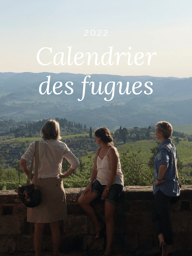 La fugue fonctionne au coup de cœur mais aussi en fonction des disponibilités ! N’hésitez pas à nous envoyer un email avec TOUTES vos envies. Mais un conseil, si une place est disponible pour une des fugues qui vous plaisait, foncez ! De plus, nous thématisons pour offrir une variété de lieux, de rencontres et d’outils mais le cœur de la fugue reste la bande de fugueuses, les échanges, la magie de la réflexion. Que vous partiez à Florence ou Venise, cela n’a finalement pas autant d’importance que cela.