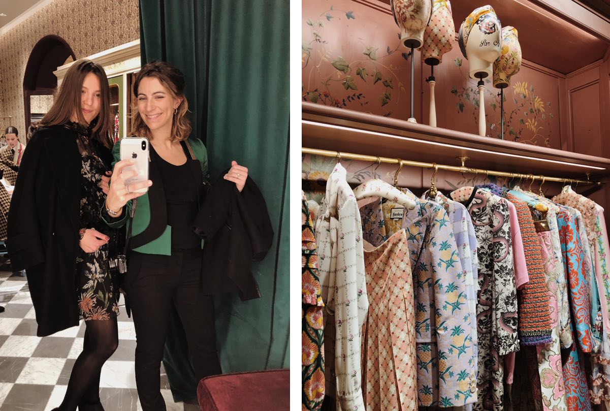 Au fond, un tout nouveau restaurant – Osteria Gucci – dont la carte est supervisée par le chef le plus célèbre d’Italie, rien que ça, Massimo Bottura (chef 3 étoiles de l’Osteria Francescana, 6 mois d’attente pour une table minimum). Là je n’ai pas trop de détails sur la carte, si ce n’est que le chef souhaite proposer une cuisine mixant florentin (il y aura de la viande chianina !), mexicain et japonais. Bref, un menu surprenant et réjouissant où vous pourriez éventuellement vous en sortir pour moins de 70 euros par tête. Côté décor, c’est une fois de plus Alessandro Michele qui a joué le chef d’orchestre en créant un espace chaleureux, sophistiqué tout de vert vêtu.