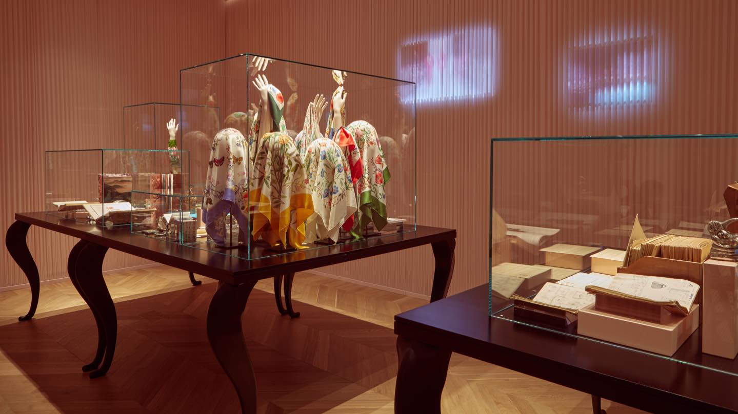 La fonction première du palais à son ouverture était un musée et cet objectif n’a pas été perdu de vue. Au 1er et 2ème étage, c’est la curatrice Maria Luisa Frisa qui prend le relais et propose sa version de la « Galerie » Gucci. Moins statique qu’un musée, les salles et les thèmes s’enchainent en mixant sans complexe les périodes et les designers. C’est ce dernier point que je trouve très agréable … En prenant un commissaire d’exposition «neutre », le musée permet de ressortir les thèmes forts et de nous faire admirer l’évolution de la marque sans nous attarder sur les petits jeux de pouvoir entre designers (rappelons qu’à l’ouverture sous Frida Giannini, les beaux habits de Tom Ford sous Gucci avaient été oubliés, une salle lui rendant « hommage » ayant été ouverte il y a seulement deux ans). La mise en scène du musée est très chouette, avec des projections d’anciens défilés ou de fabrication des malles il y a 50 ans, j’ai trouvé le tout extrêmement poétique et inspirant. Alors il n’y a pas 30 salles à visiter, mais pour les fans du double GG, c’est plus qu’il n’en faut pour respirer l’âme de la marque et repartir des images fortes plein la tête.