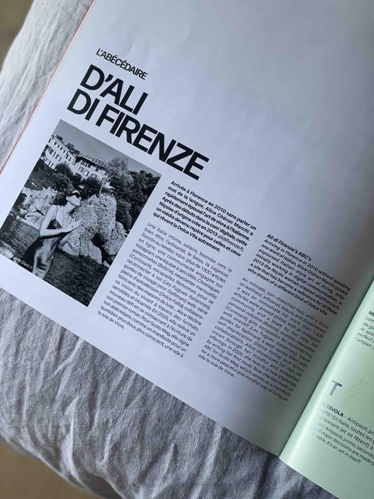 Merci à la GUSTO FAMILY de Nice de m’avoir ouvert les portes de leur très beau magazine. C’est la journaliste Pauline Weber qui a imaginé un article sous forme d’abécédaire. Des lettres qui m’inspirent des émotions, des lieux, des moments italiens et qui sont les fondations de ma philosophie de vie italienne.
