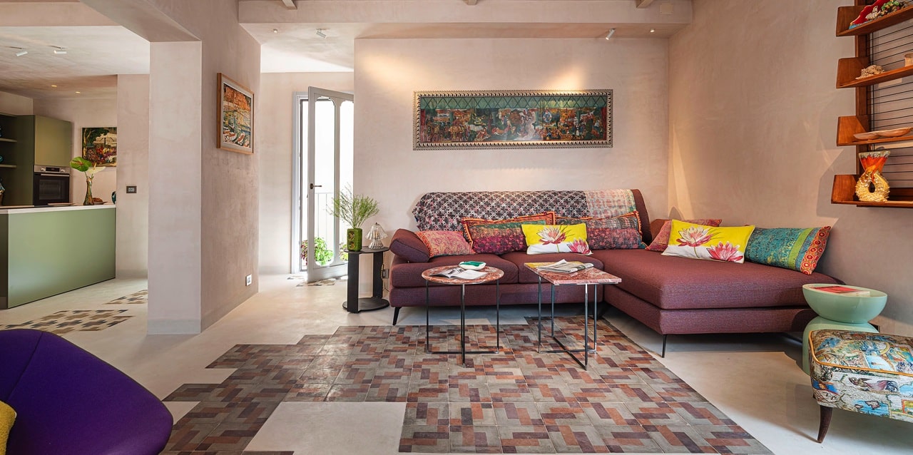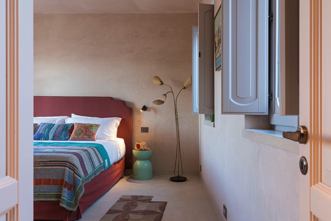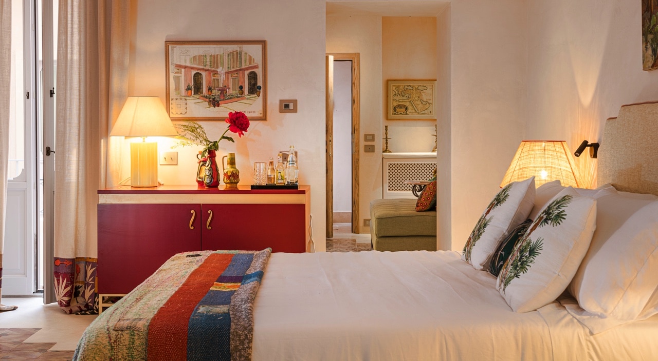 L’ambiance est aussi sophistiquée que simple, aussi éclectique qu’épurée. Aux murs clairs répondent les tonalités chaudes des céramiques des salles de bains, les couleurs vives des khantas indiens disposés sur les lits, des pièces de mobilier et de décorations chinées en Normandie, à Paris et naturellement en Sicile. Ébénistes, marbriers, ferronniers d’art, restaurateurs de pierre des alentours, ont tous collaboré à ce projet dans ses moindres détails.