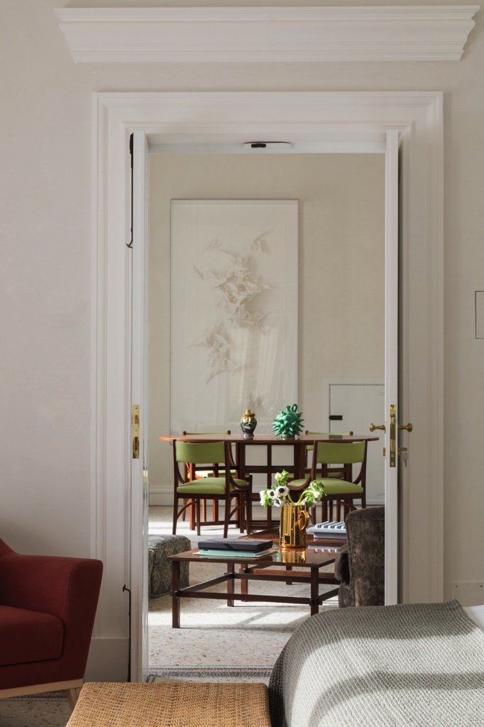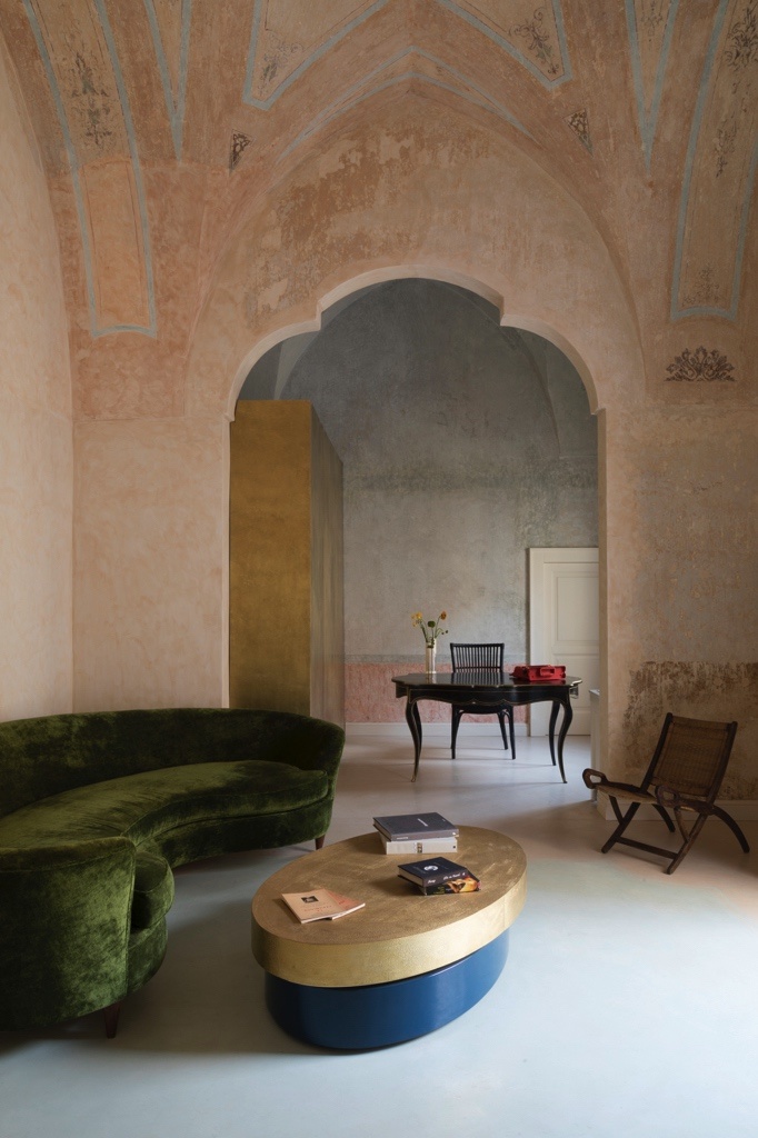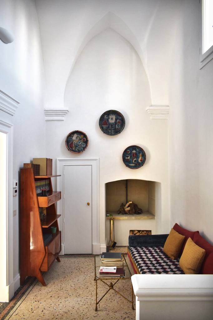 Un savant mix de pièces d’art contemporain et de mobilier collector italien chiné chez des antiquaires (bibliothèque Ico Parisi, tables basses Gianfranco Frattrini, chaises Gio Ponti, céramiques Enza Fasano et Guerrino Tramonti). La toile de fond de ce joyeux florilège? De la pierre brute, des voûtes en ogive et des fresques anciennes redécouvertes lors des travaux.
