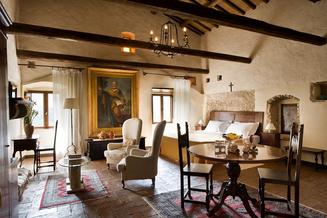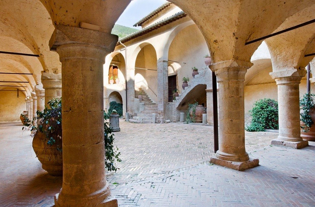 Résidence d’époque dans son jus et typique du centre de l’Italie. Pierres anciennes, poutres en bois, cloître, église romane dotée fresques, un décor authentique préservé qui nous immerge totalement dans un lieu de culte séculaire.