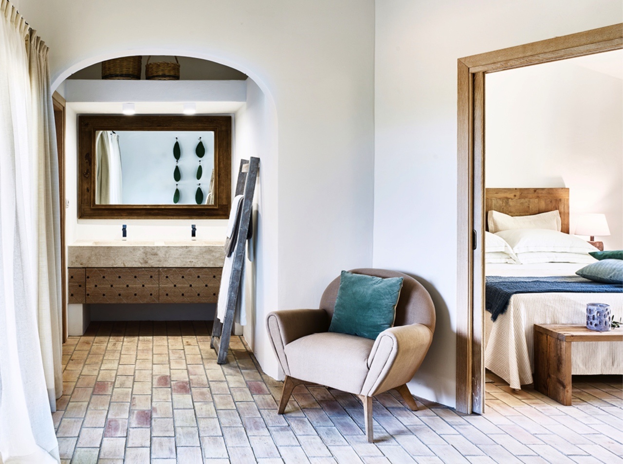 Une réinterprétation actuelle du style rural ancien de la région. Les architectes ont privilégié 100% de matériaux naturels: le chêne, le liège, la pierre claire, la terre cuite, le coton et le lin. Le mobilier et la décoration sont simples mais élégants et soignés.
