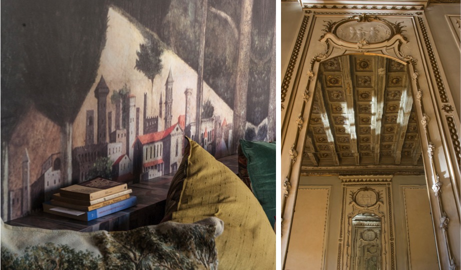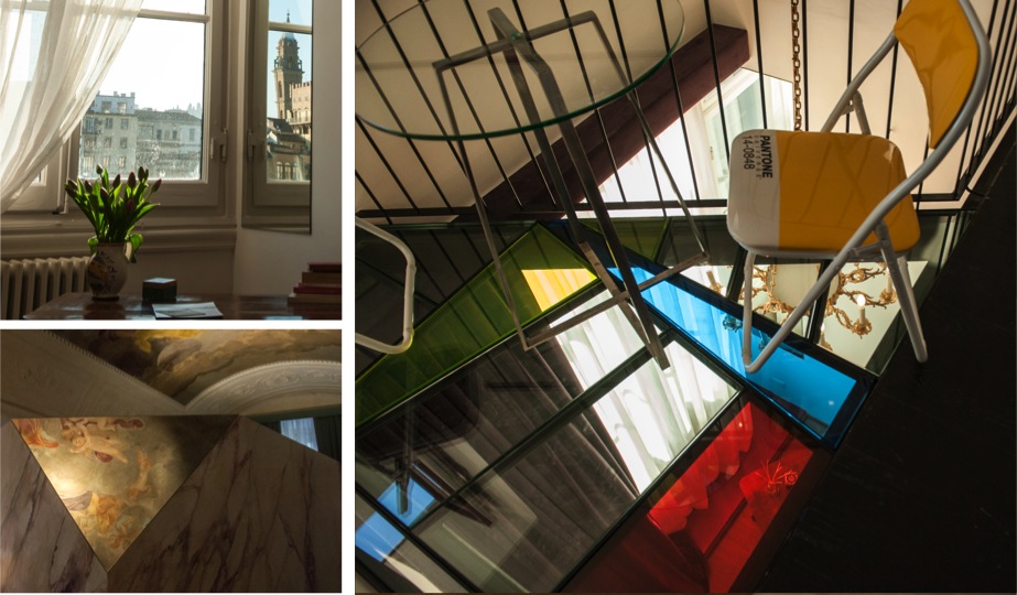 Piero Brarda, qui a projeté le lieu, a d’ailleurs joué sur deux aspects : utiliser autant que possible des meubles et détails déco d’époque provenant du patrimoine familial (ou les détourner comme ces lampes canons qui proviennent d’anciens corniches en bois au dessus des fenêtres) mais également jouer sur la modernité des couleurs, des accrochages, des jeux de transparence dans les escaliers ou sur le plancher multicolore des mezzanines.  Il y a également des pans de mur décorés de reproduction d’arbre généalogique ou de décor d’autres propriétés vinicoles appartenant à la famille.