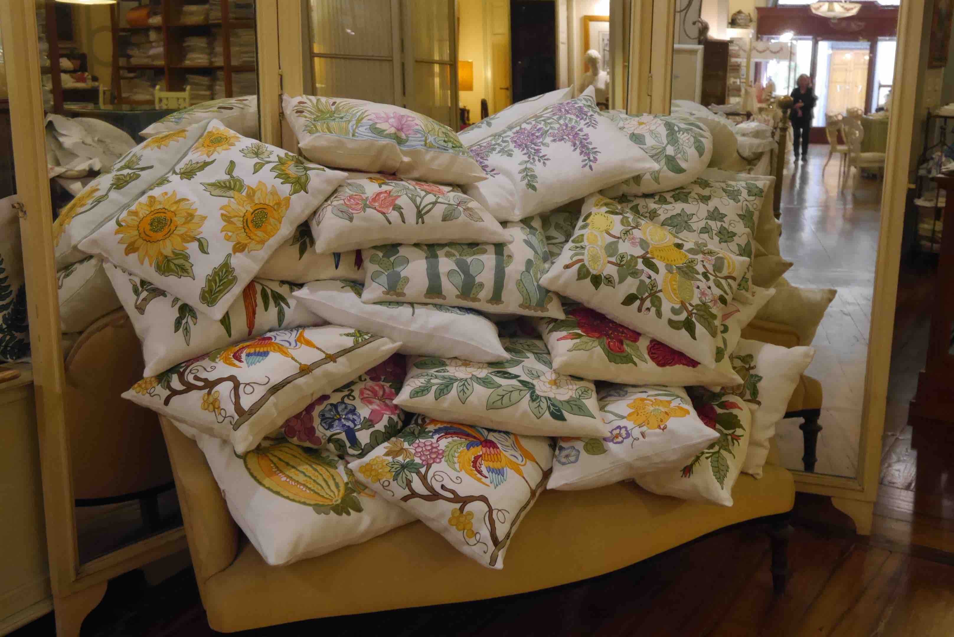 Depuis toujours il y a une grande attention au client, une écoute. Nous développons des lignes pour la maison totalement personnalisées en fonction des besoins. Parfois une de nos vendeuses vient me voir et me dit « Lucia, tu devrais aller lui parler »… Les clients savent écouter mes recommandations et se fient à l’expérience. En discutant j’immagine leur espace et propose un dessin, une broderie, quelque chose d’inédit qui sera alors réalisé dans la boutique. Et puis, il suffit d’ouvrir nos placard pour découvrir nos animaux colorés sur coussins, nos nappes brodées de fleurs, nos pyjamas en soie, nos nuisettes sensuelles et toujours de bon goût.