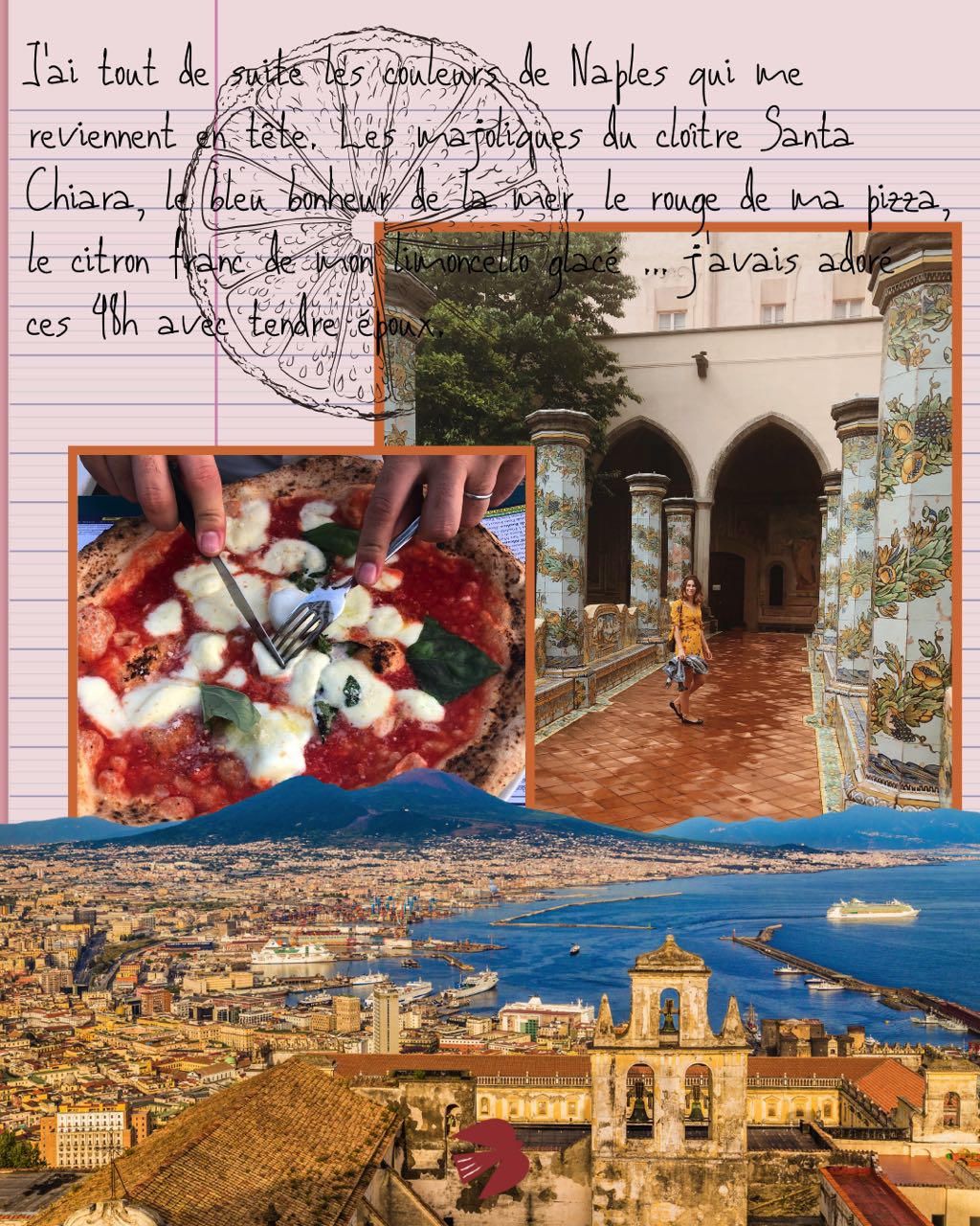 Je pense Palette italienne et j’ai tout de suite les couleurs de Naples qui me reviennent en tête. Les majoliques du cloître Santa Chiara, le bleu bonheur de la mer, le rouge de ma pizza, le citron franc de mon limoncello glacé … j’avais adoré ces 48h avec tendre époux.