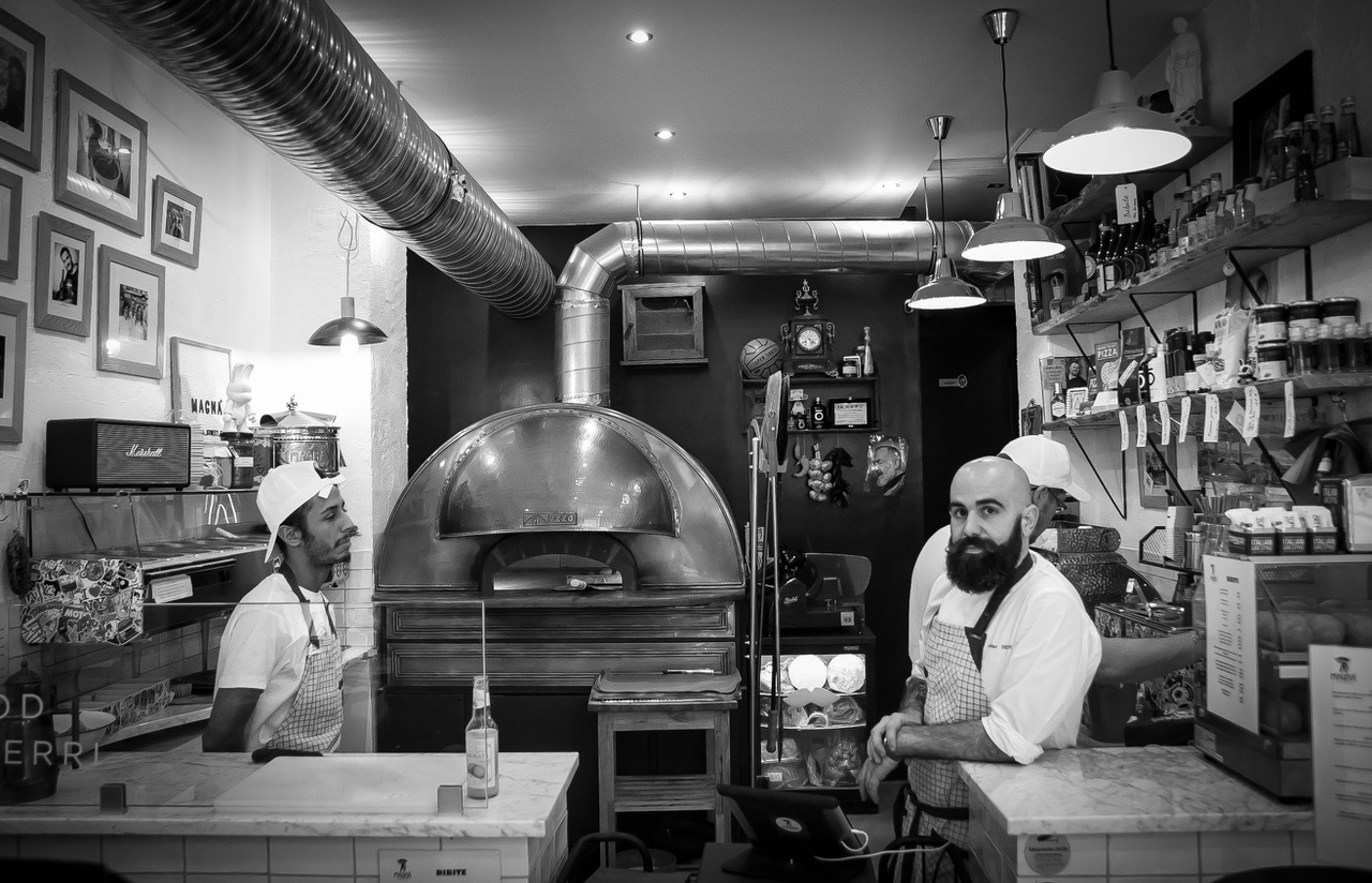 Il arrive juste après ces expériences, où je cherche comme un fou un local digne de ce nom ! J’avais en tête de faire du slowfood, de faire du bon, et j’avais un produit, la pizza portafoglio de Napoli, délicieuse et économique. Je suis tombée sur le local dans lequel tu es assise aujourd’hui, c’était une crêperie. J’ai vu le quartier, bobo hipster, j’ai vu aussi une population bourgeoise, populaire, bref un bon mix, et enfin Alessandra Pierini qui avait installé son Epicerie Italienne RAP au bout de la rue et qui a éduqué tout le quartier à la gastronomie italienne… J’ai dit banco.