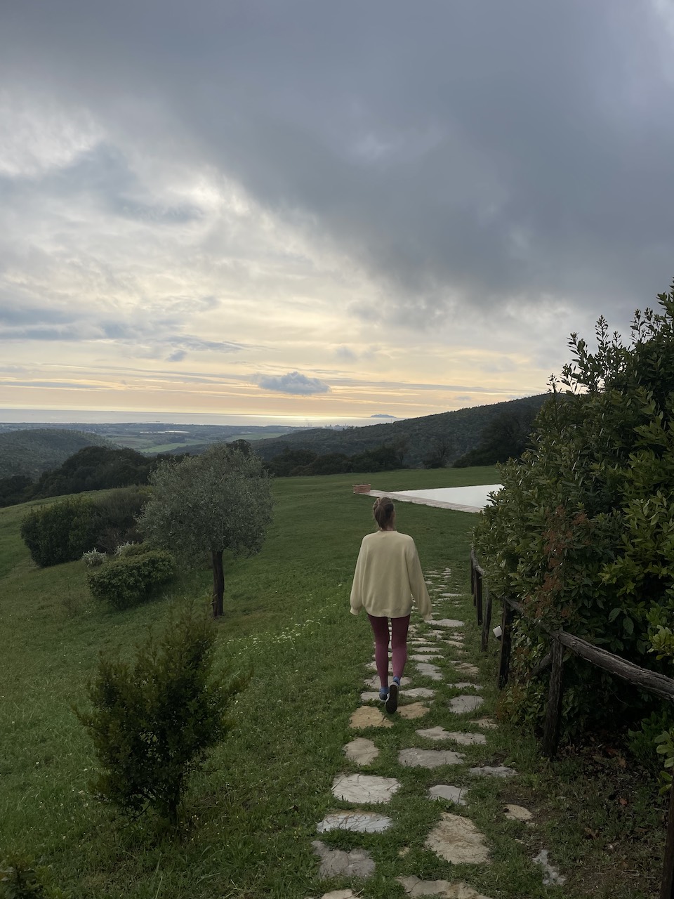 Nous étions en Maremme, dans la partie sud de la Toscane, au milieu des bois, en haut d’une colline donnant sur la mer. Deux maisons l’une à côté de l’autre, une simplicité chic qui n’invitait qu’à une seule chose, le repos de l’âme en regardant les flots devant nous. Quand j’ai ouvert la porte de ma chambre et remarqué que depuis le lit je pouvais voir la mer, je savais déjà que j’y passerai beaucoup de temps. J’étais appelée par cette idée du vide, du rien, comme jamais et par l’envie profonde de m’écouter et de me laisser couler comme un être mou qui abandonne enfin la rigidité de son quotidien et de ce qu’elle s’impose.