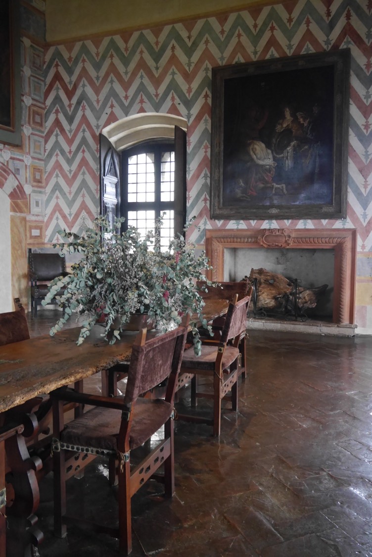 Petit bonheur du matin, ouvrir les volets et admirer la vue, même si ce matin, on ne voit pas à dix mètres à cause du mauvais temps ! Nous plions bagages et avons repéré une dernière visite à faire qui est pratiquement sur la route du retour à Florence, le château Rocca d’Angera. Surplombant le lac depuis la rive orientale, la construction qui date de l’époque médiévale se visite en entier. À l’intérieur, des salles avec de très belles cheminées, des salons élégants, des fresques et une particularité : un musée des poupées. Certaines sont complètement flippantes … mais je leur chiperais bien leur set de vaisselles en céramiques peintes à la main ou la table en marbre qui ressemble à s’y méprendre à la Saarinen que nous avons reçu en cadeau de mariage. Les jardins possèdent de beaux pieds de vigne (Andrea me précise que les propriétaires pourront surement produit 6 voir 7 bouteilles vu le nombre de pieds… alala, il est si snob ce fils de vignerons du Chianti !).