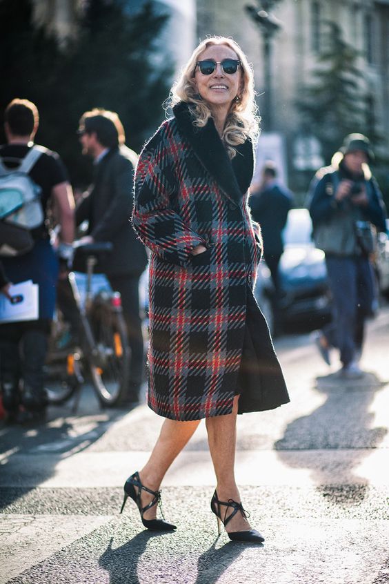 Oui je sais … On espère tous que ce soit de la fausse fourrure ! En attendant les manteaux de Franca ont toujours un style fou, notamment ce modèle assez imposant à carreaux. Le rebord moumouté ajoute une touche sophistiquée qui encadre le visage (toujours souriant, vous aviez remarqué?). Si le dit manteau n’a pas de col en fourrure, pas de problème, elle en ajoute un (la photo du manteau vert). À noter, la féminité des chaussures qui joue le contraste des volumes.