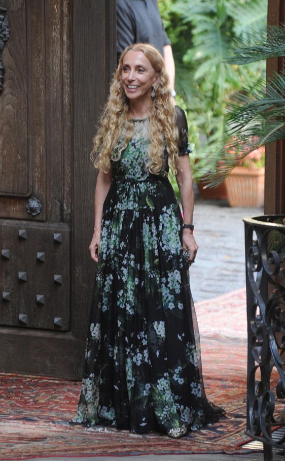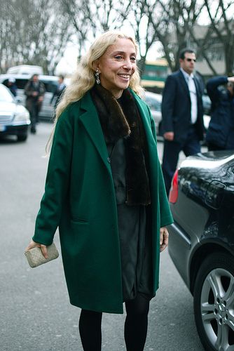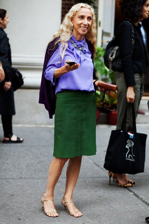 Franca sait mieux que personne associer des couleurs fortes, oser des mélanges comme pour composer un tableau. Franca en vert et violet c’est un paysage, une forêt qui se réveille, un lac pas loin. Notez toujours la délicatesse présente quelque part, que ce soit des chaussures aux brides finissimes ou des boucles d’oreille. Quand on y réfléchit bien, associer des couleurs improbables mais justes, est une façon merveilleuse de revisiter toute sa garde robe sans dépenser un euro. À méditer !