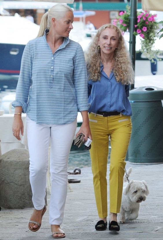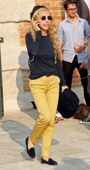 Passion pantalon jaune ! Comme moi ! Elle l’habille avec de simple slippers à la vénitienne, associé à un tee-shirt sombre ou bien une chemise fluide. Cela pourrait passer pour un outfit assez simple, mais les matières sympas et les couleurs rendent le tout chic et indémodable. Notez comme les deux pantalons sont parfaitement coupés.