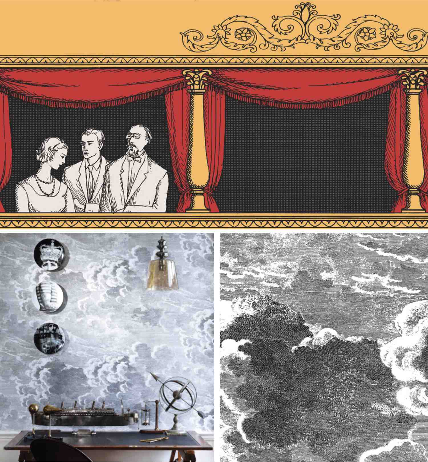 Cole & Son est un fabriquant anglais très haut de gamme de papier peint avec des collections en propre et des éditions spéciales.  Pour Fornasetti il y a 2 collections disponibles. A chaque fois ce sont des motifs sortis des archives, agrandis, multipliés pour un résultat toujours très théâtral.