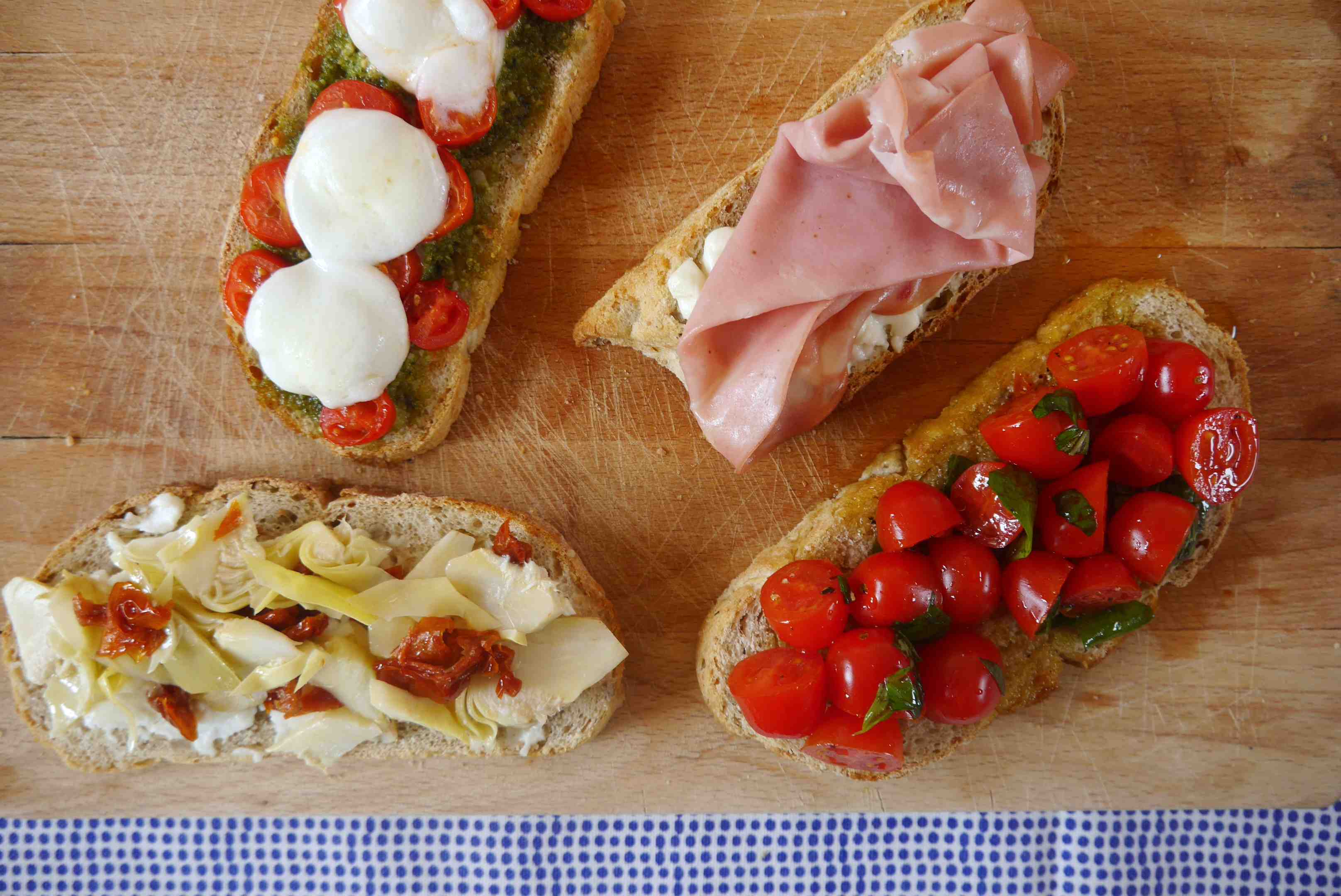 Ce qui nous intéresse aujourd’hui ce sont les crostoni, des morceaux de pain plutôt conséquents sur lesquels on peut mettre un peu de tout en mélangeant par exemple fromage et charcuterie.