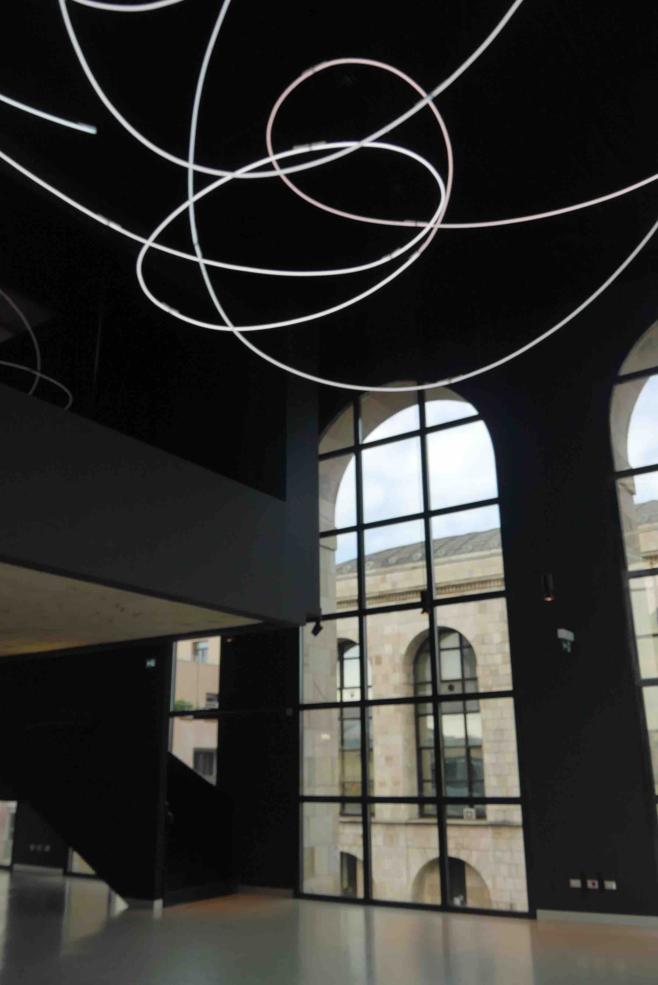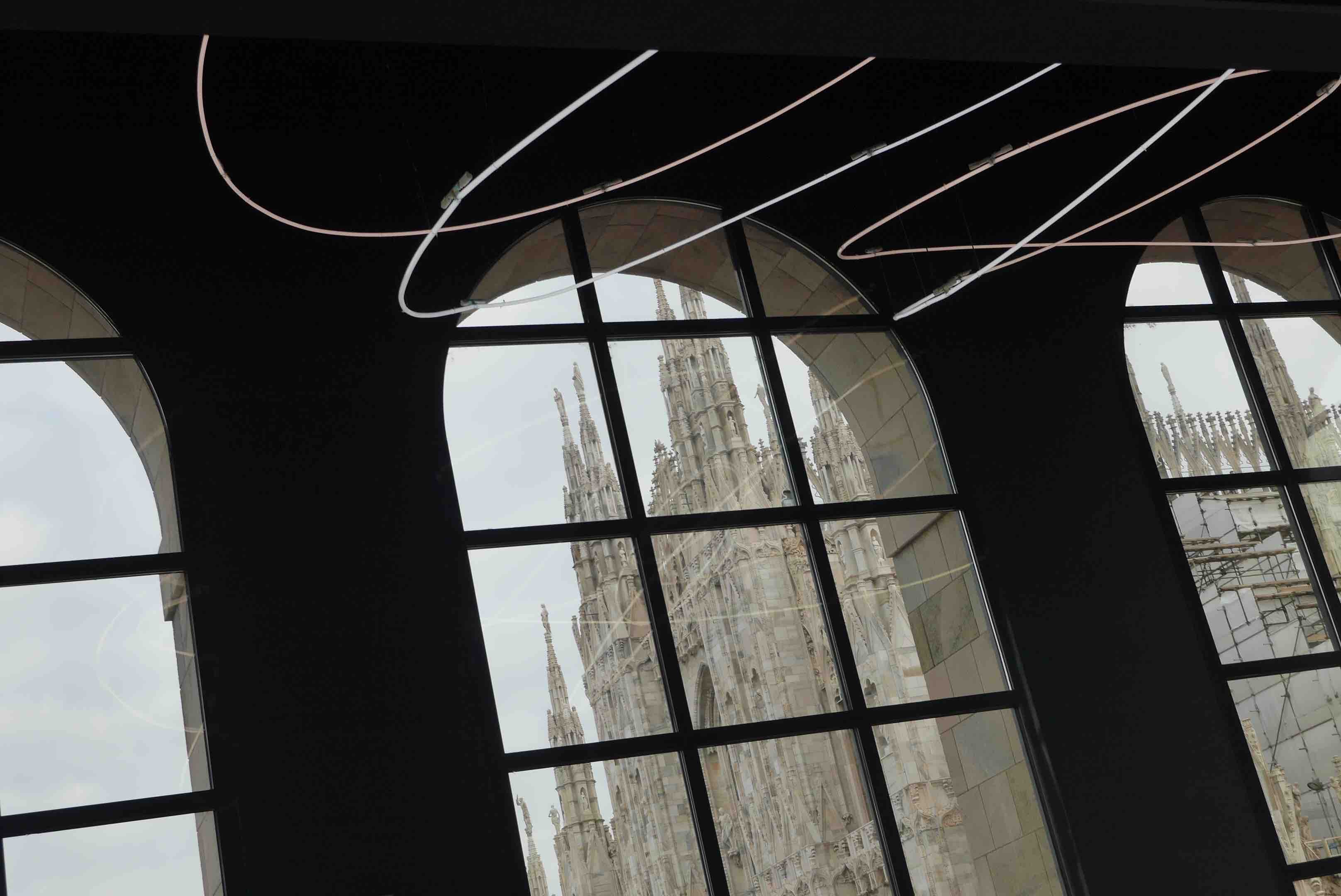 J’avais très envie de découvrir le musée du Novecento à Milan et j’ai profité de la Fashion Week de septembre pour y faire un saut entre deux présentations. L’art du 20ème siècle n’est pas forcement ma tasse de thé, mais j’étais intriguée par l’architecture des lieux (du coup j’ai pris plus de photos des « lignes » du musée que des oeuvres) et par son adresse exceptionnelle. Situé sur la place du Duomo, il offre en effet une vue extraordinaire sur la cathédrale mais aussi sur les galeries et sur la vie de la place. On reste un moment la bouche ouverte au dernier étage du musée, devant cette immense baie vitrée et sous le néon de Lucio Fontana.