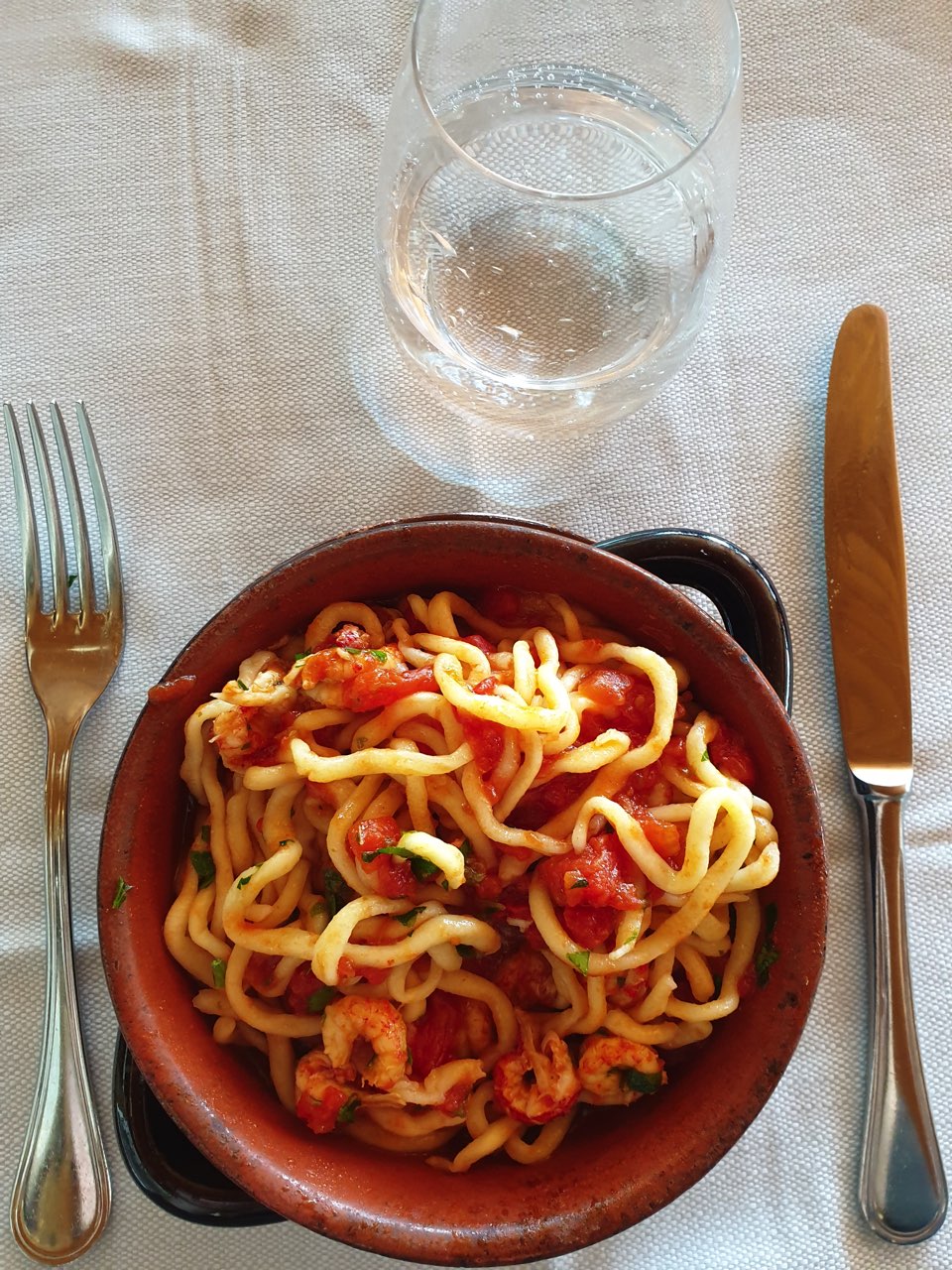 Je redémarre pour 3-4km et puis m’arrête à San Feliciano, car c’est ma dernière chance de me restaurer avant la fin du parcours, à cette période en tout cas. En plus, j’ai ma petite idée derrière la tête: aller manger des spécialités de poisson chez Da Settimio, restaurant de poisson historique de la région! Je choisis les crostini aux poissons du lac et ensuite les umbricelli aux crevettes du lac. Un régal. Je clôture le repas par une glace artisanale à quelques mètres du restaurant, chez Polo Nord.