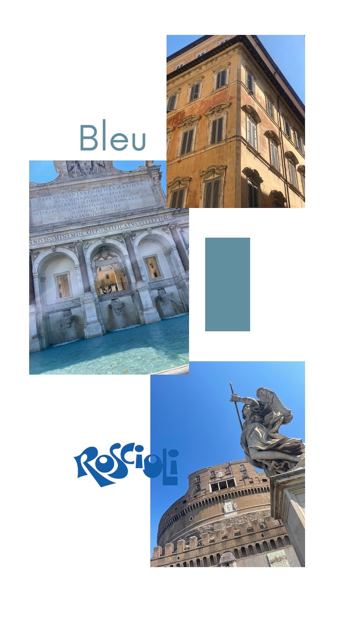 « Un bleu comme un ciel d’hiver franc que l’on ne peut qu’admirer qu’à Rome, la fontaine de Gianicolo qui brille au soleil avec vue sur la ville, les volets qui tirent du bleu vers le gris et créent une palette folle avec le rouge des façades. »