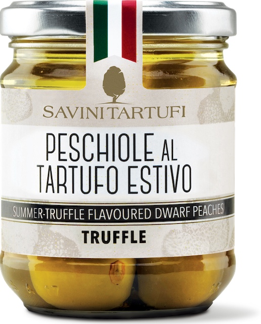 - Ingredients: Peschiole (petites pêches) 53%, huile de tournesol, sel, arôme, vinaigre de vin, sucre, truffe d’été séchée (Tuber aestivum Vitt.) 0,1%