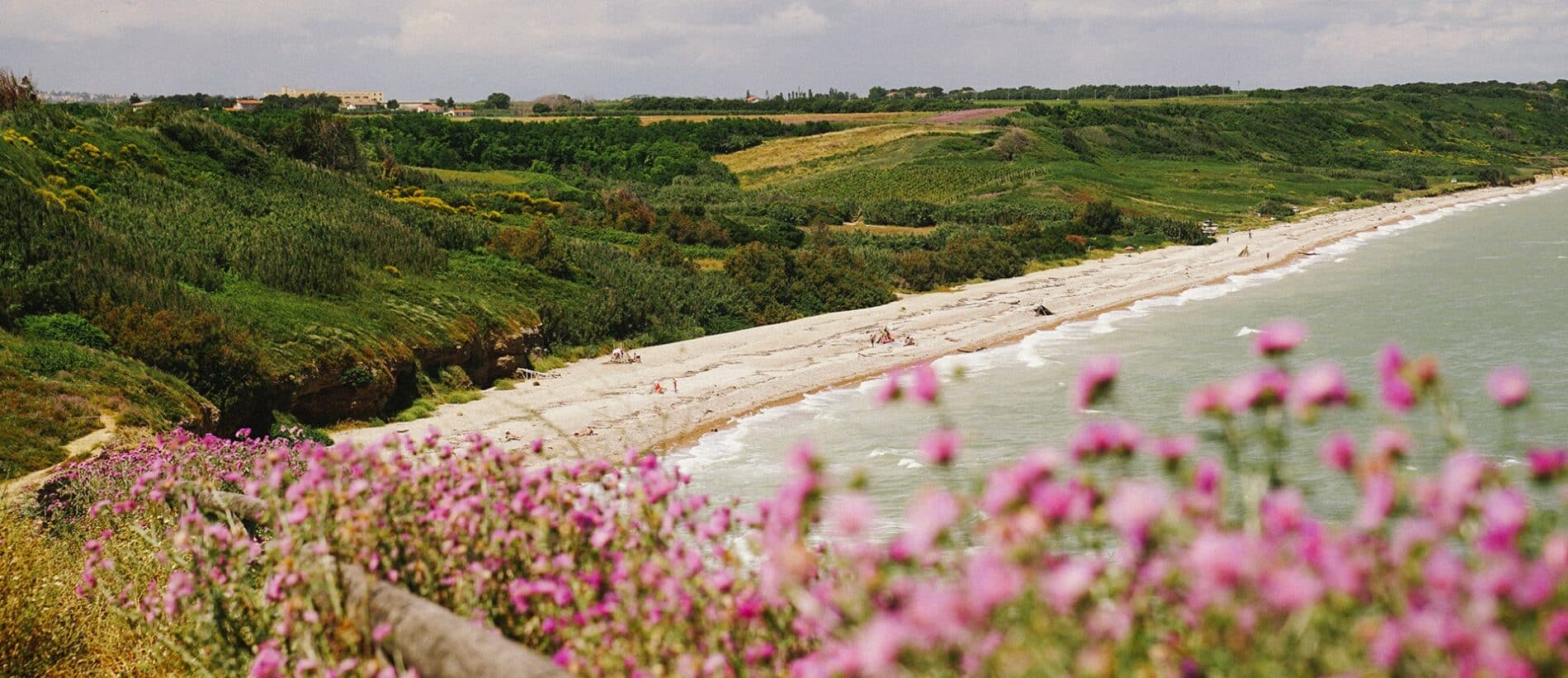 Le truc de Céline, ce sont les plages préservées, si possible un peu sauvages. À Punta Aderci, elle est servie. On y accède seulement à pied après s’être garé au parking du nom de la réserve naturelle. Le chemin qui y mène est très joli (et n’est pas trop long), on se croirait en Normandie, en haut des falaises, des petites fleurs parsemant notre route. Le chemin se fait ensuite un peu raide pour arriver sur la plage de sable doré.