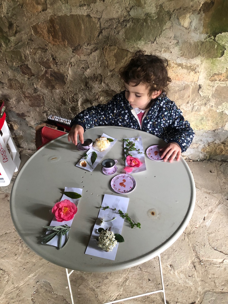 Le tableau excel de tendre époux devient vite une bénédiction. Après le yoga, c’est moi qui attaque mon heure avec les enfants et on part récolter des fleurs et des feuilles dans le jardin pour décorer les « serviettes » de notre pop up restaurant. C’est merveilleux de voir les enfants aussi attentifs quand vous prenez le temps de leur dédier votre attention. Ils m’écoutent, me suivent à la trace. Cela dure peut être 22 minutes, mais dieu qu’ils ont été parfaits ! Ensuite c’est la grande partie de foot quotidienne puis on file déjeuner.