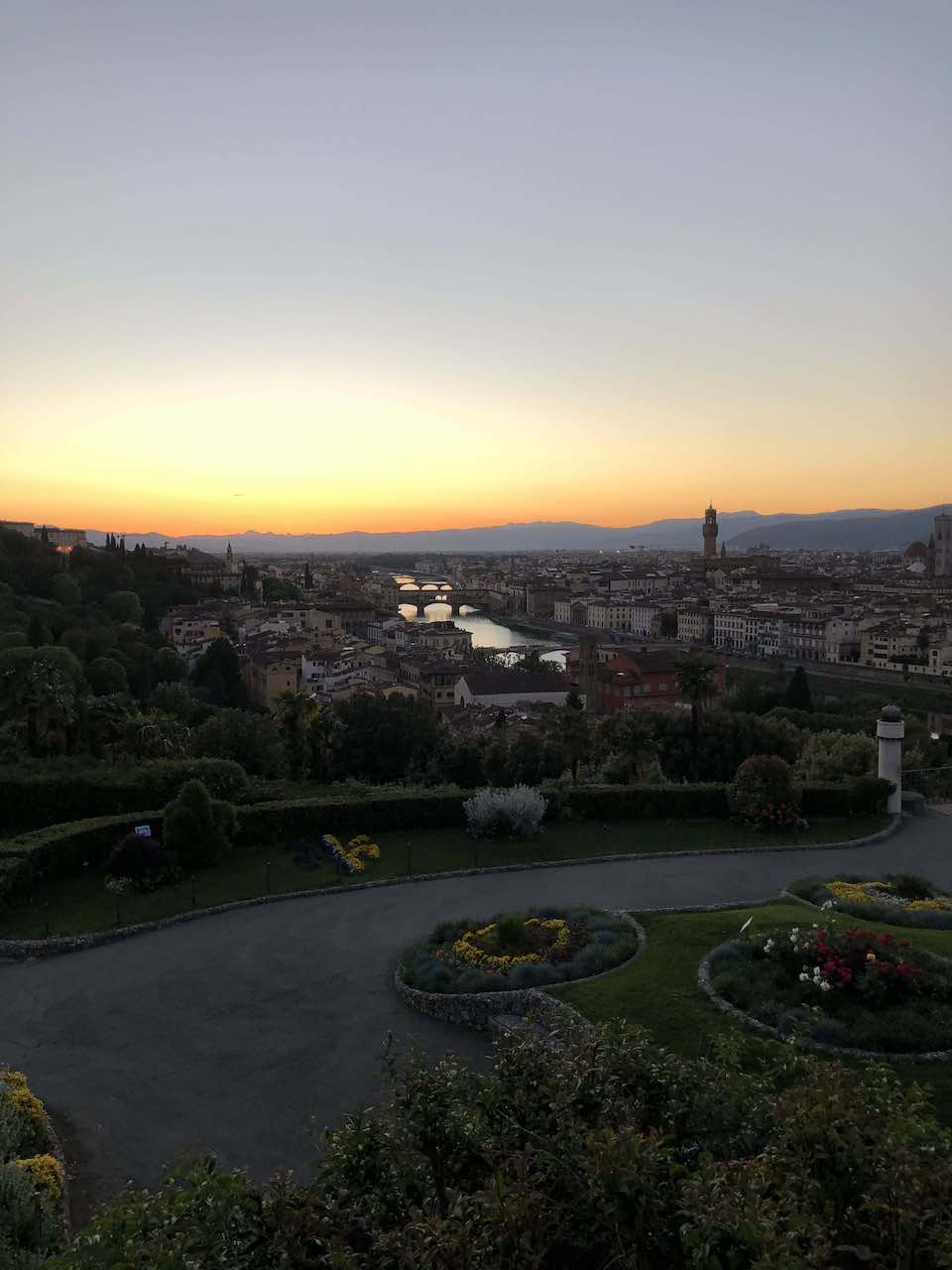 Par deux fois, nous avons délibérément organisé une sortie avec tendre époux, « comme ça, pour aller voir ». Quand les enfants vont dormir chez belle-maman, nous allons marcher. MARCHER. Enfiler un legging de sport, sentir ses cuisses s’activer, fatiguer après l’effort, mettre des chaussures qui pour une fois sont utiles. Il y a 10 jours, nous sommes partis de chez nous à Pian dei Giullari pour descendre à San Niccolo, au Piazzale Michelangelo. Un cadeau. Première aventure, passer « le point de non-retour » la limite maximale de nos sorties avec Leone et Bianca juste à côté de la maison durant le confinement strict. Premier frisson de liberté. Puis découvrir le Duomo au détour d’un virage, revoir les collines d’en face (Fiesole) et arriver sur le viale Galileo. Frémir de plaisir en entendant la circulation. Oh un klaxon ! En arrivant au Piazzale, une dizaine de personnes pas plus (nous avons décidé de faire une balade la nuit, en partant vers 20h de chez nous). Les derniers rayons du soleil s’effacent derrière l’horizon. Il ne nous reste plus qu’à observer dans le silence l’enfilade des ponts illuminés et tous nos monuments adorés.