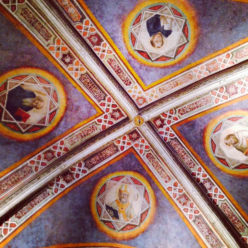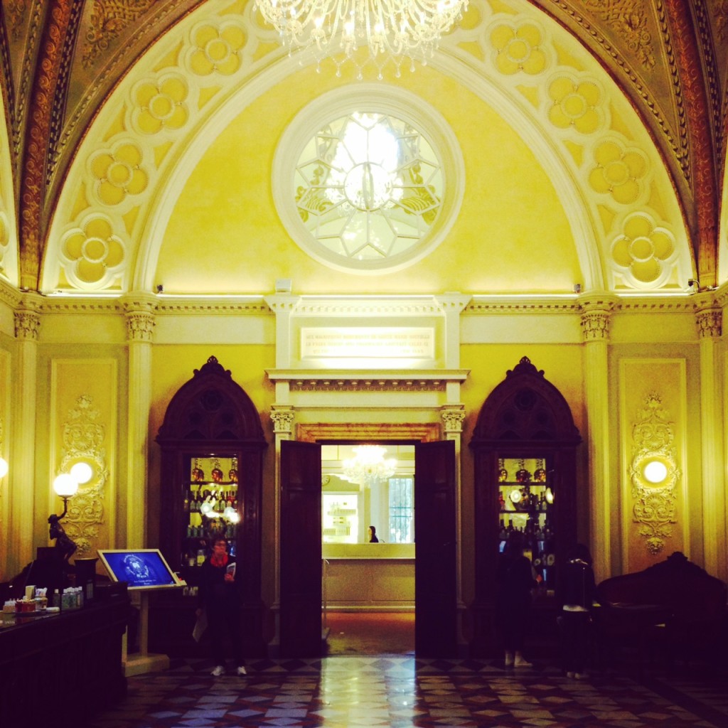 Une entrée pourtant discrète via della Scala, vous poussez les portes pensant avoir trouvé une adresse sympathique et là … c’est l’enchantement. Dorures, 5 mètres sous plafond, anciennes fioles de parfums datant de 13ème siècle, vue sur le cloître et ses peintures, sacristie décorée de fresques de Mariotto di Nardo; le lieu est unique au monde et impose presque, monastère attenant oblige, un silence respectueux.