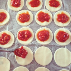 - Enlevez l’excédent de pâte entre les formes de pizza et versez sur le centre de chaque rond une petite cuillère de sauce tomate.