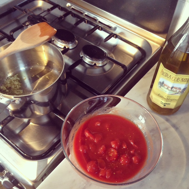- Commencez par préparer votre sauce : dans une casserole, mettre une cuillère à soupe d’huile d’olive, faire revenir un peu d’ail puis déposer les tomates. Cuire à feu doux une vingtaine de minutes, saler, poivrer.