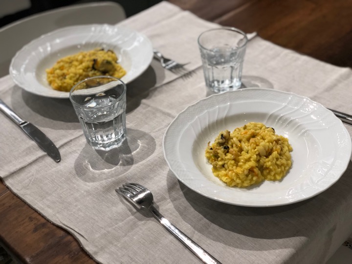 Doucement mais sûrement, le niveau des risottos s’élève ! Alors que je testais pour la première fois un risotto au safran il y a dix jours, j’ai décidé d’upgrader immédiatement la recette avec des fruits de mer et des fleurs de courge. Je précise que la recette fonctionne sans ces dernières (ou bien avec de simples courgettes). Mais bon, qu’est-ce que c’est chic d’avoir des fleurs jaunes magnifiques émincées et jetées au dernier moment dans son riz. Oui, je suis snob, même aux fourneaux !