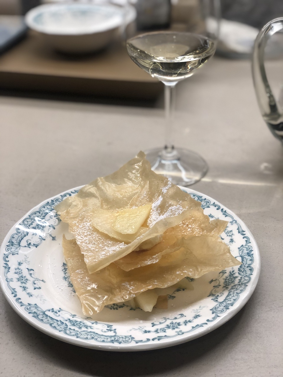 Un millefeuille de pâte filo, mascarpone à la noix de coco et poires caramélisées (une recette également apprise au cours de cuisine chez “Desinare”).