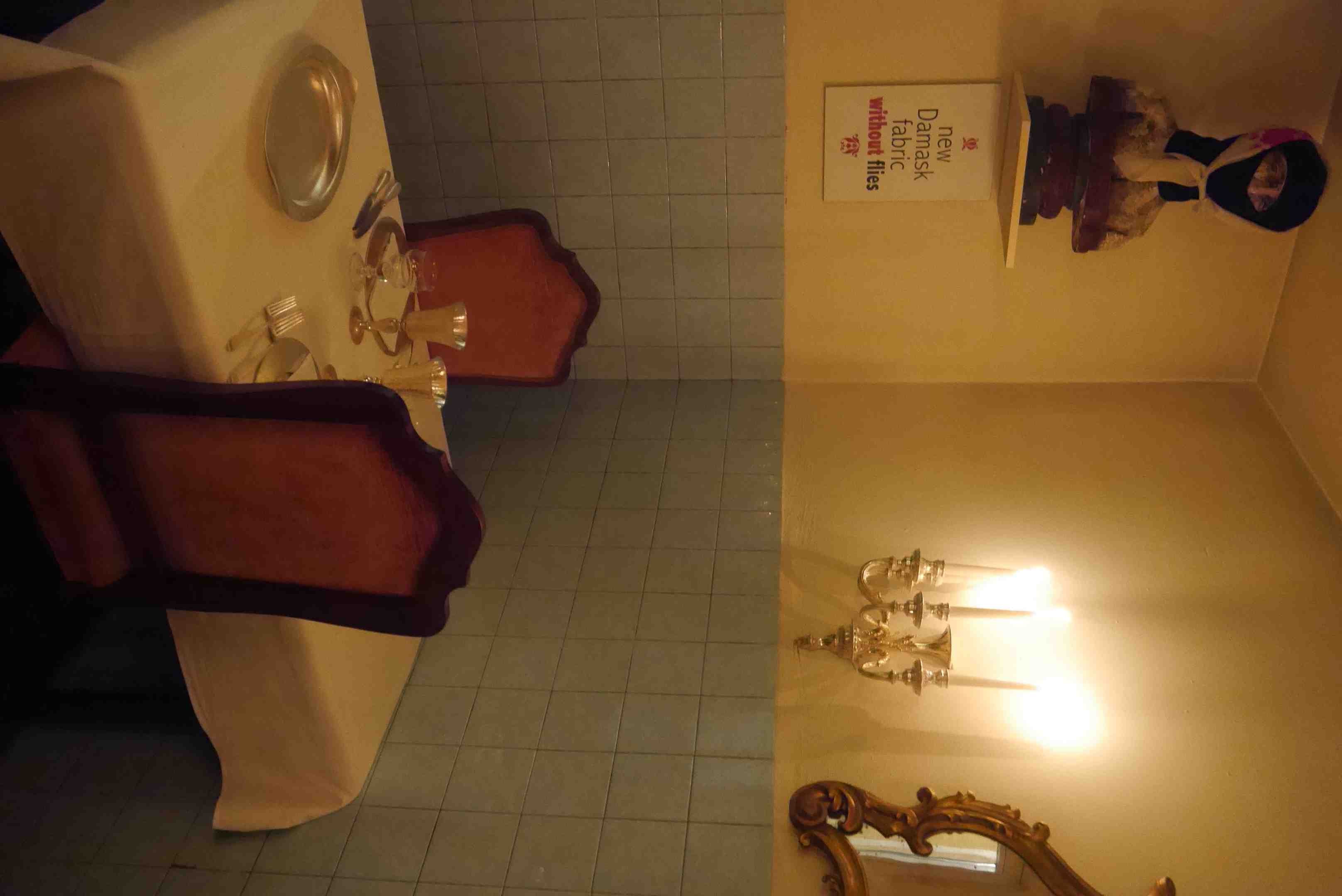 Le restaurant au premier étage où vous pouvez aller diner est né d’une constatation très simple il y a deux ans : avec un chandelier et des verres en argent, une salle sans charme et une table en bois prennent des allures de fête. Et cela fonctionne ! Le travail de l’argent avec un rendu martellé crée des reflets, joue avec la lumière et l’association à une céramique blanche côté vaisselle (avec des motifs que l’argentier travaille habituellement pour ses pièces), crée un set très moderne. Qui a dit que l’argent était un cadeau de mariage des années 50?