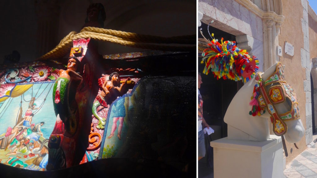 Heureusement il y a le somptueux amphithéâtre gréco-romain qui vaut le déplacement à lui tout seul. Construit dans sa première version au III° siècle av.JC, il offre un panorama exceptionnel sur la mer et le volcan. Lors des concerts (très fréquents à la belle saison voir le programme ICI) il y a une ambiance enchanteresse quand les voies raisonnent encadrées par un ciel étoilé. Côté visite, j’ai également aimé faire un tour à la microscopique exposition de charrettes traditionnelles entièrement peintes à la main qui répondait bien au cliché sicilien que j’avais en tête !