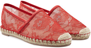 - L’espadrille rouge sang parée de dentelle délicate pour rendre à ce soulier avec semelle en corde ses lettres de noblesse.