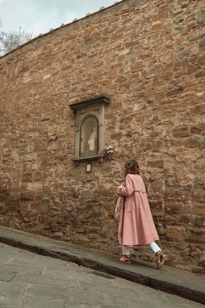 Plusieurs options sont possibles. Si vous visitez le quartier de San Niccolo et plutôt que de vous agglutiner sur les marches du Piazzale Michelangelo, tournez à droite après la porte massive de San Niccolo et crapahutez jusqu’à l’entrée du Belvedere. De là, une route enchantée s’offre à vous comme un trésor, c’est la via San Leonardo. Murs de pierres qui serpentent, entrées de villas où les jardins degringolent jusqu’au niveau de la ville, teintes orangées, rouges et jaunes accompagnées de volets verts typiques, c’est un concentré de calme et de charme florentin. Arrivé.e au feu, tournez à gauche pour reprendre le Viale Michelangiolo et visitez l’église de San Miniato al Monte avant d’aller admirer le coucher du soleil au Piazzale. Depuis Porta Romana ou le quartier de San Frediano, grimpez vers la colline de Bellosguardo et de Marignolle. En moins de dix minutes, vous êtes face à des hectares d’olivier et des cyprès bordant les entrées de luxueuses villas. Passez une tête quand les portails s’ouvrent ou se referment, bien souvent des statues jouent à cache cache dans les parcs. Favolosa Firenze !