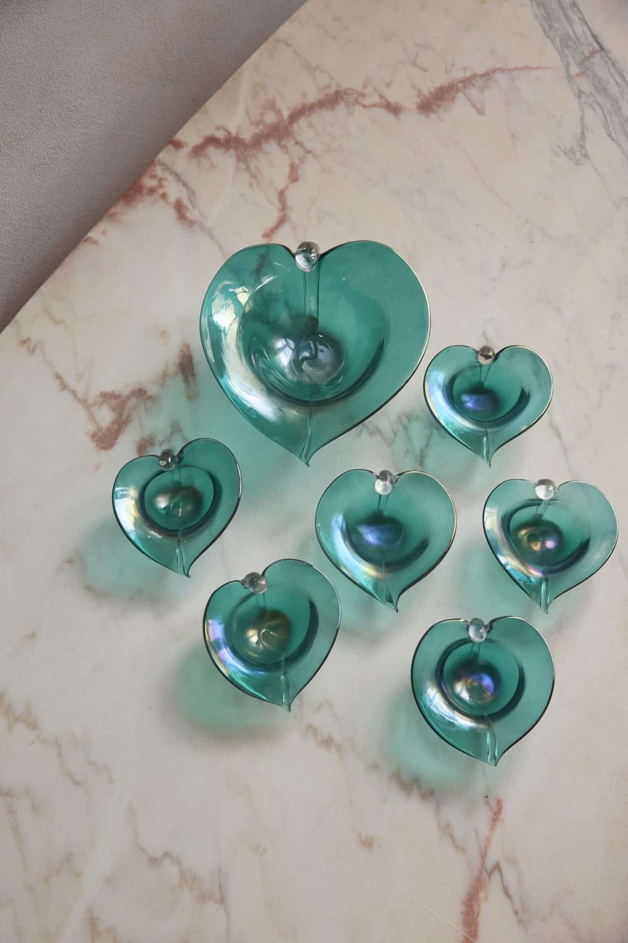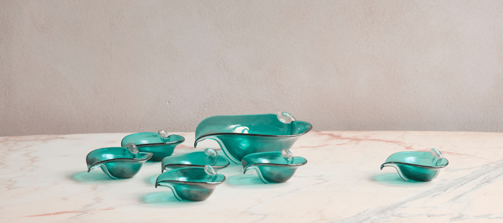 Service vert irisé en forme de feuille, par Alfredo Barbini, Ermenegildo Ripa, années 1950. Service de sept pièces (1 bol et 6 tasses) en forme de feuilles vertes irisées, soufflés à la bouche, par Alfredo Barbini, à Murano, vers 1950. Chaque pièce est ornée d'anses transparentes. Elles illustrent le style moderniste organique de Barbini et la technique de Murano d'après-guerre. J'adore le verre soufflé à la bouche vintage, il a une certaine magie et cette couleur est incomparable.