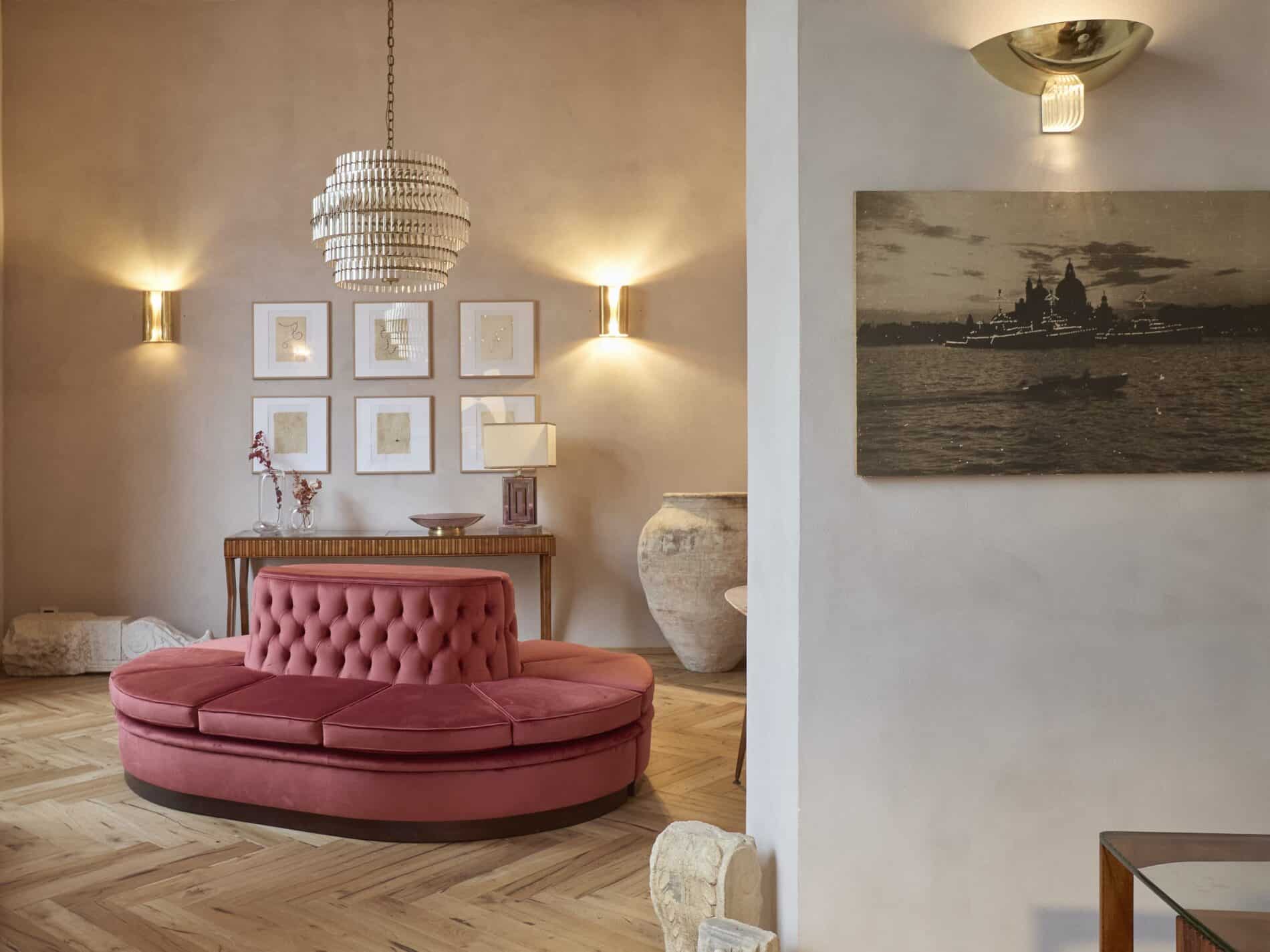Canapé « Torta » en velours vieux rose, années 1960, retapissé. J'adore ce canapé rond italien « Torta ». Celui-ci date des années 1960 et nous l'avons restauré et retapissé dans un velours de soie vieux rose. Il peut être placé sous un lustre dans une entrée majestueuse ou séparé en deux pour être disposé le long des murs, façon Médicis.