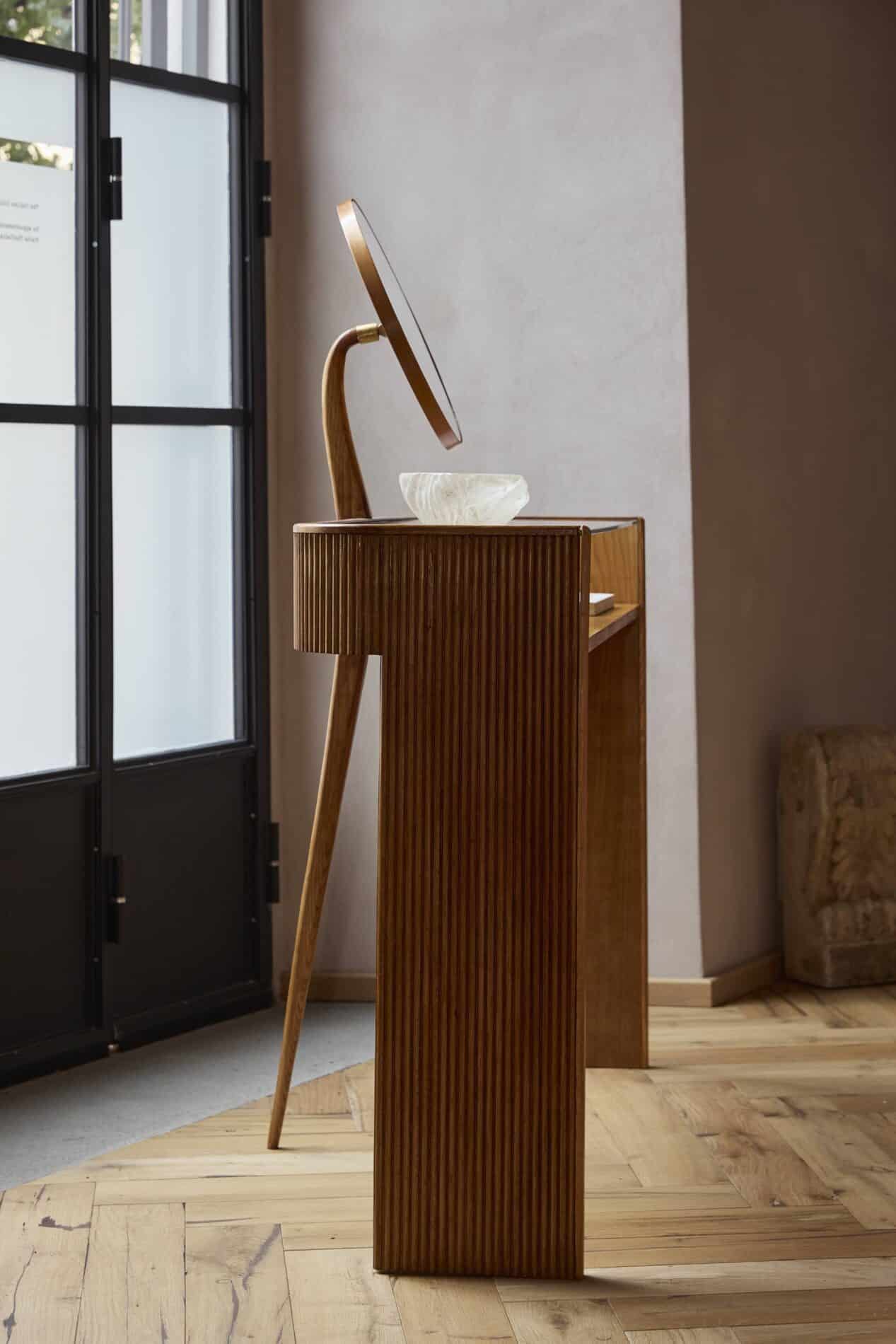 Coiffeuse Paolo Buffa des années 1960. Cette élégante coiffeuse des années 1960 signée Paolo Buffa incarne le savoir-faire raffiné qui caractérise l’âge d’or du design italien. J’ai adoré l’effet palissandre strié, l’élégant pied cannelé à l’arrière et le miroir qui est réglable.