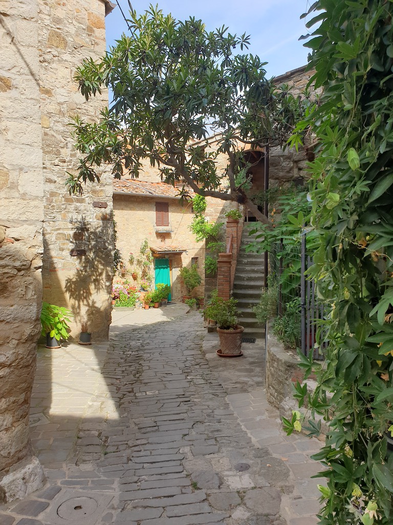 Depuis le parking, rejoignez l’église Santa Maria (via les escaliers qui montent et entrent dans le centre historique). Une fois arrivés à l’église, prenez la route goudronnée sur la gauche (indications : San Casciano et Mercatale). Marchez pendant une trentaine de minutes sur la route goudronnée (légère circulation de voitures mais les paysages en valent la chandelle). Arrivés à un carrefour, prenez le chemin de terre sur la droite (indications : Il Panzanello et Montegonzi), suivez-le jusqu’à une première bifurcation et tournez à gauche après la maison (pas d’indications mais une marque rouge et blanche). Descendez dans la campagne, continuez tout droit et profitez de la vue. Le chemin remonte ensuite, passe dans un petit bois, d’abord de vieux chênes puis de cyprès et amène au lavoir de Montefioralle. Tournez à droite, vous êtes arrivés dans ce joli hameau fortifié !