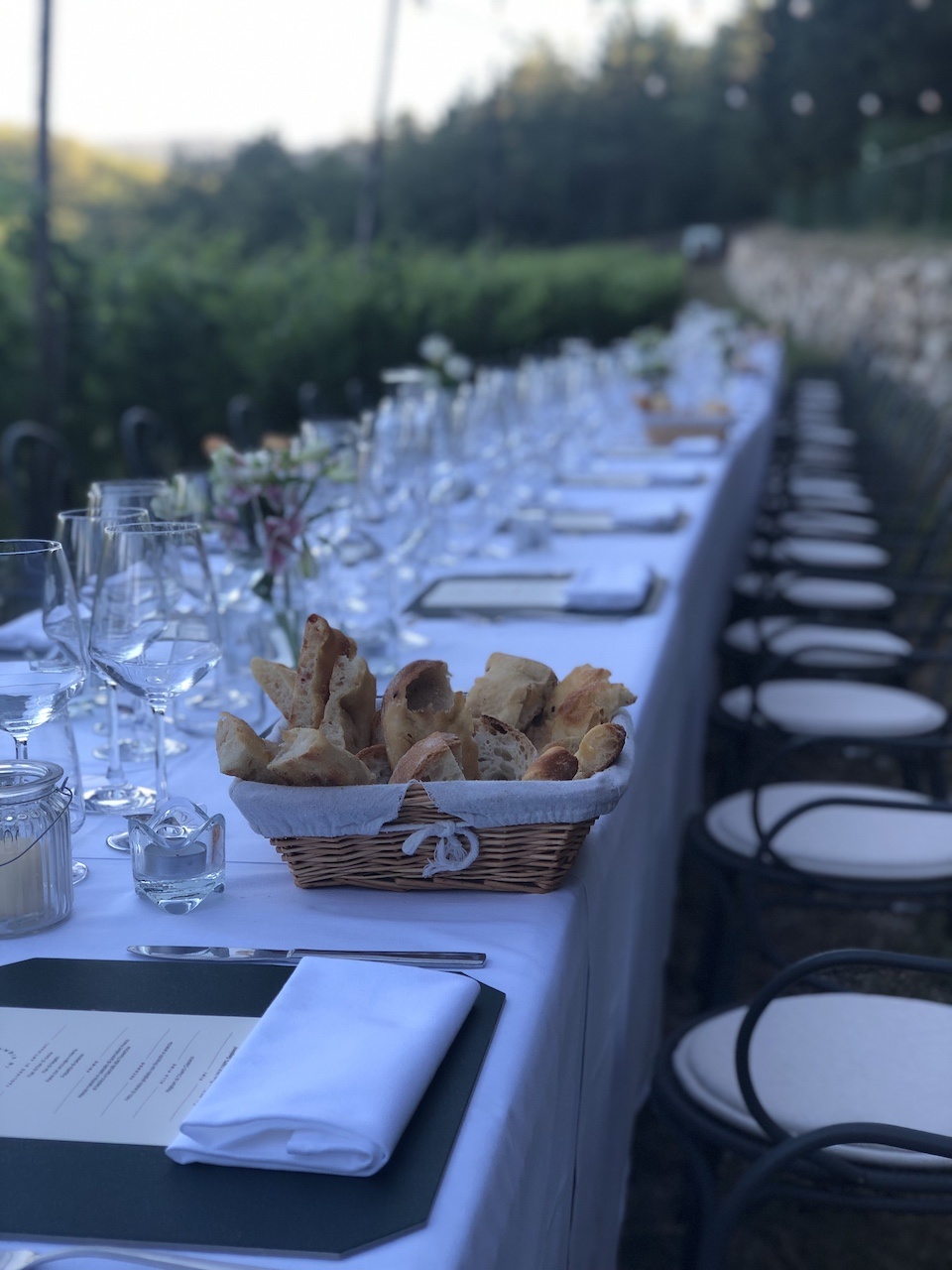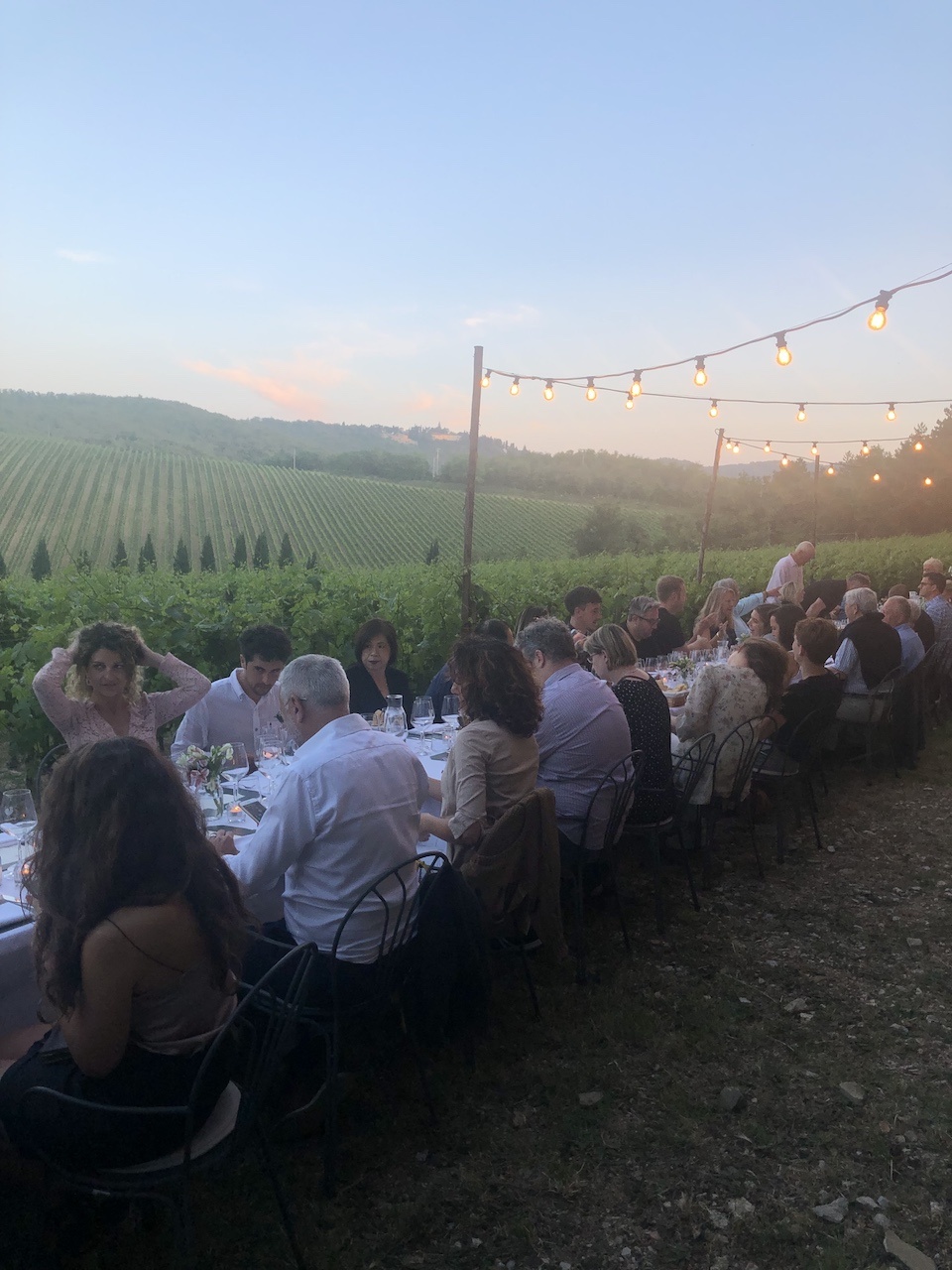 Vous croyez qu’on en a fini ? Je ne crois pas ! Sur le trajet du retour, on s’arrête pour un dîner dans les vignes à Querceto di Castellina. Le clou du spectacle. Une seule table longue à n’en plus finir, des bougies, du vin, des mets délicieux et surtout, ce cadre enchanteur. Un moment unique! Attention, ces dîners ne sont organisés qu’à la haute saison et la réservation est indispensable. Vous pouvez aussi dîner simplement sur la terrasse.