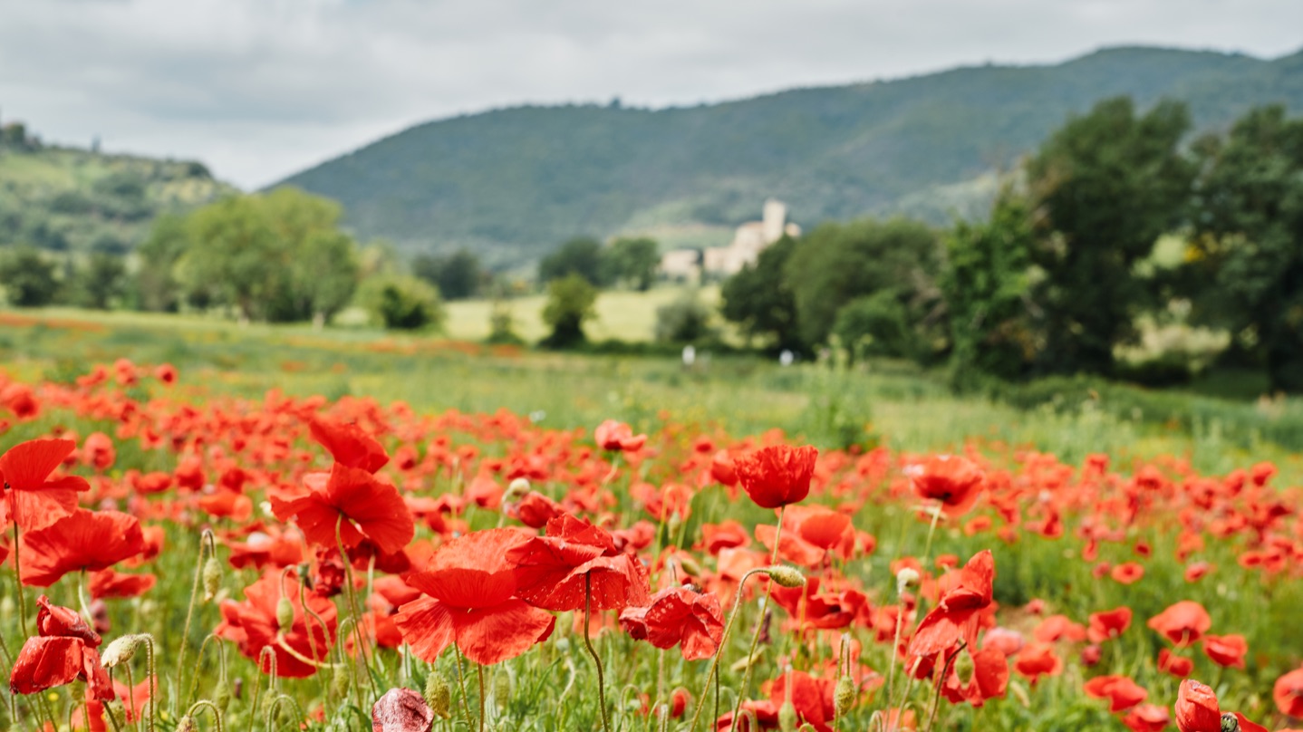 À l’approche de l’abbaye de San Antimo, un must de la région, il y a des champs de coquelicots à perte de vue. Quel spectacle ! Le rouge des fleurs se prolonge en vert profond avec les cyprès, puis c’est le bleu, intense du ciel qui finalise la palette de couleurs du jour.
